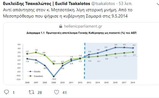 Με tweet απάντησε ο Ευκλείδης Τσακαλώτος, στο tweet του προέδρου της ΝΔ, Κυριάκου Μητσοτάκη, με το οποίο ευχαριστούσε τον υπουργό Οικονομικών, γιατί "παραδέχθηκε επιτέλους ότι τα πλεονάσματά του καταστρέφουν την οικονομία και δεσμεύτηκε ο ΣΥΡΙΖΑ να στηρίξει την προσπάθεια που καταβάλλω εδώ και 3 χρόνια για να τα μειώσω".