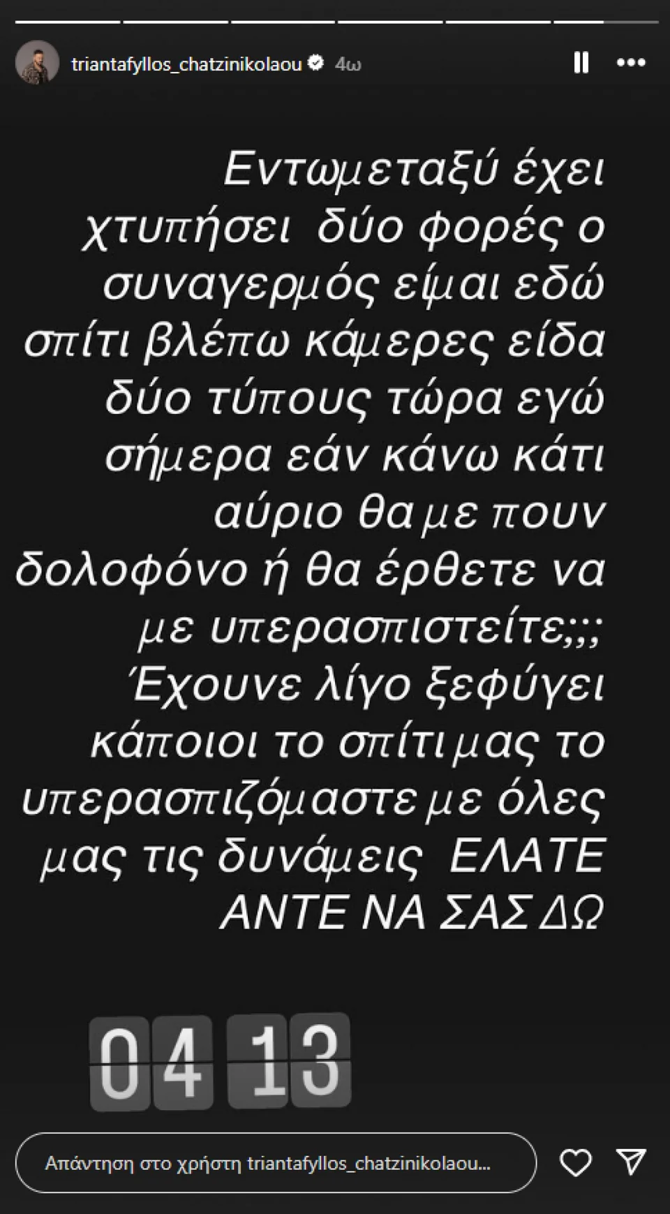 Σε insta story του ο τραγουδιστής ανέφερε: «Εντωμεταξύ έχει χτυπήσει δυο φορές ο συναγερμός. Είμαι εδώ σπίτι βλέπω κάμερες, είδα δυο τύπους τώρα. Εγώ σήμερα εάν κάνω κάτι, αύριο θα με πουν δολοφόνο ή θα έρθετε να με υπερασπιστείτε; Έχουνε λίγο ξεφύγει κάποιοι. Το σπίτι μας το υπερασπιζόμαστε με όλες μας τις δυνάμεις. Ελάτε να σας δω».