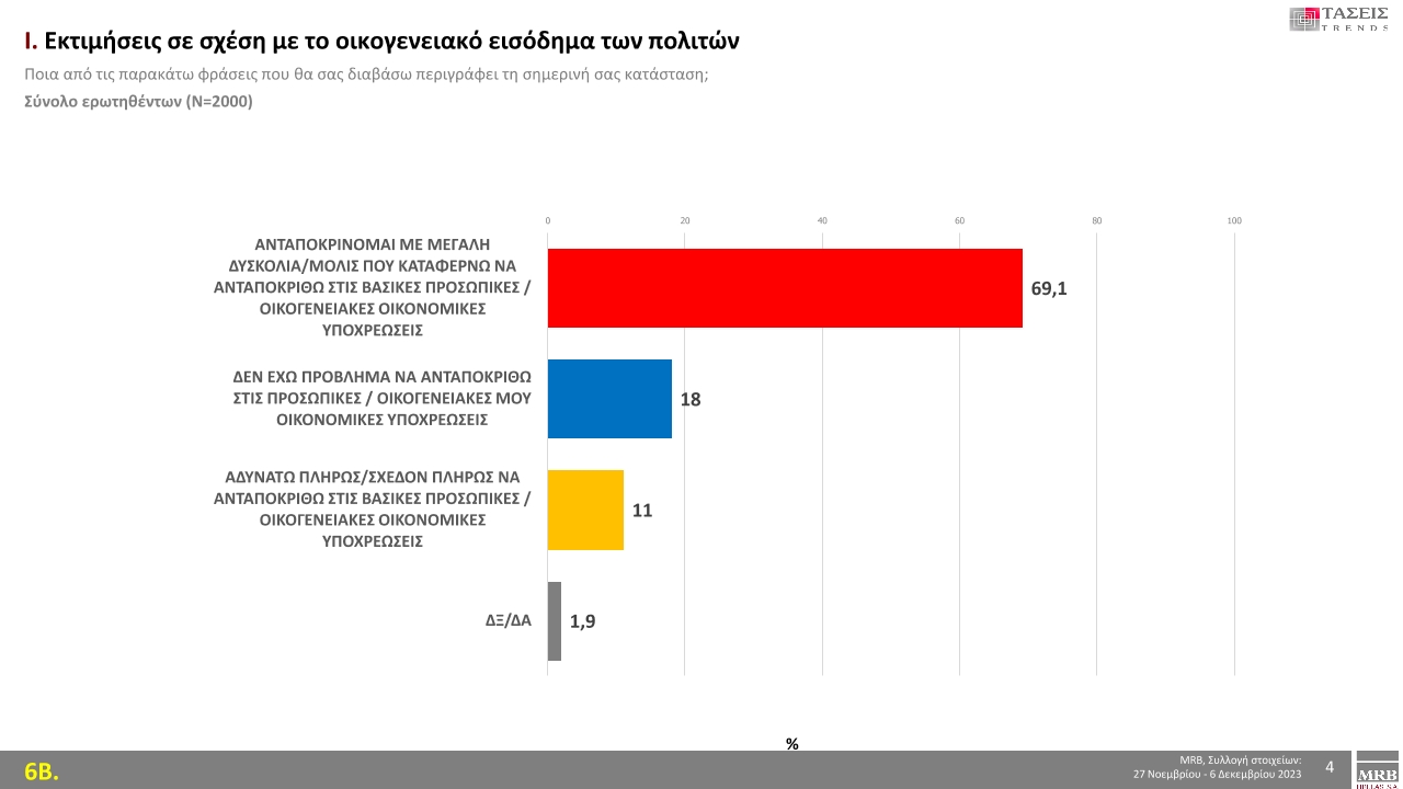 Σε ότι αφορά τις εκτιμήσεις σε σχέση με το οικογενειακό εισόδημα των πολιτών το 69,1 % απαντά “ανταποκρίνομαι με μεγάλη δυσκολία/μόλις που καταφέρνω να ανταποκριθώ στις βασικές προσωπικές/οικογενειακές οικονομικές υποχρεώσεις”.