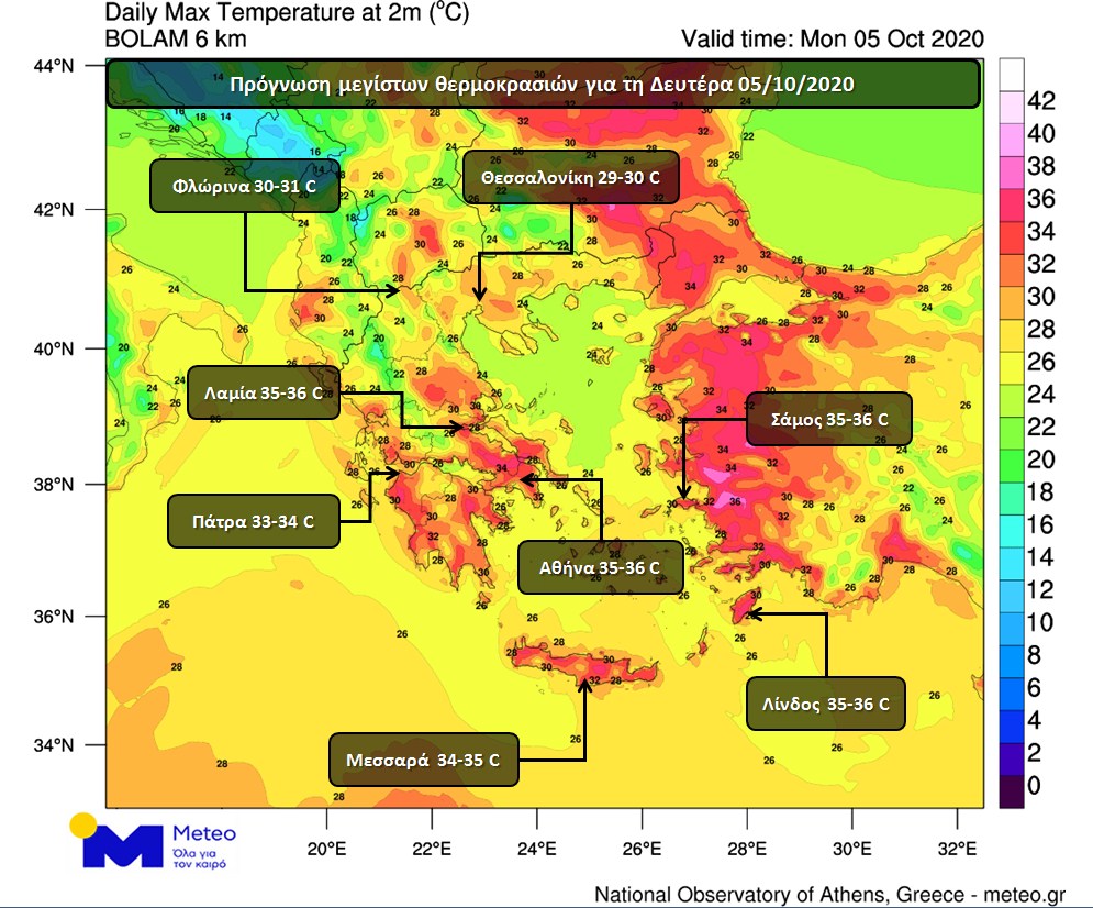 Στο χάρτη που ακολουθεί φαίνεται η γεωγραφική κατανομή της μέγιστης θερμοκρασίας το μεσημέρι της Δευτέρας καθώς και οι τιμές της σε επιλεγμένες πόλεις.