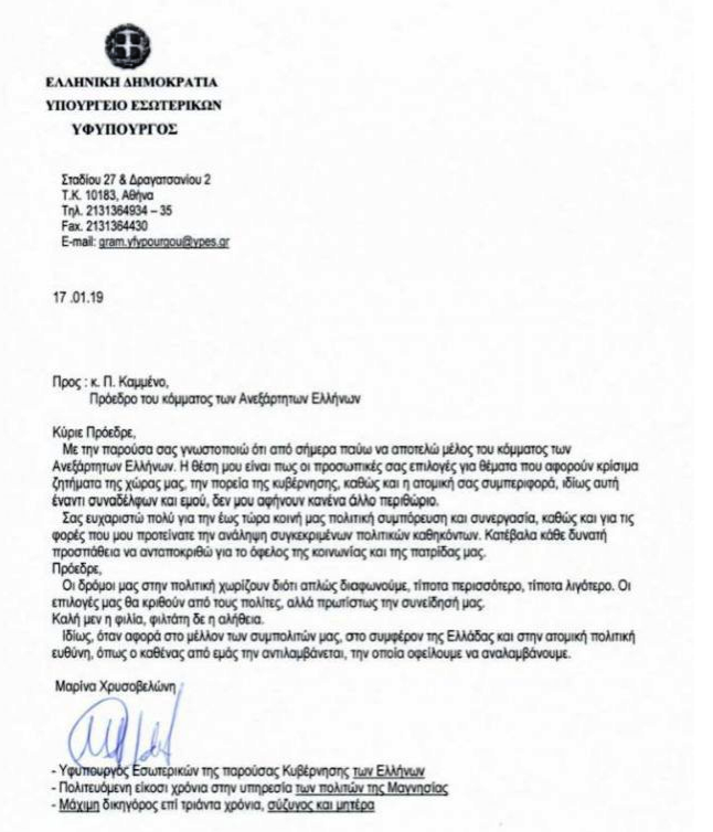 Στην επιστολή της παραίτησης της, επισημαίνει μεταξύ άλλων,ότι οι προσωπικές επιλογές του κ. Καμμένου, όσο και η συμπεριφορά του απέναντι σε συναδέλφους της, αλλά και την ίδια, δεν της αφήνουν κανένα περιθώριο.