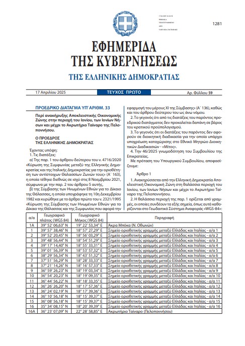 Όπως σημειώνεται συγκεκριμένα στο Προεδρικό Διάταγμα υπ’ αριθμ. 33, «ανακηρύσσεται από την Ελληνική Δημοκρατία Αποκλειστική Οικονομική Ζώνη στη θαλάσσια περιοχή του Ιονίου, των Ιονίων Νήσων και μέχρι το Ακρωτήριο Ταίναρο της Πελοποννήσου», με βάση τις σχετικές διατάξεις της ελληνοϊταλικής συμφωνίας του 2020 και της Σύμβαση των Ηνωμένων Εθνών για το Δίκαιο της Θάλασσας.