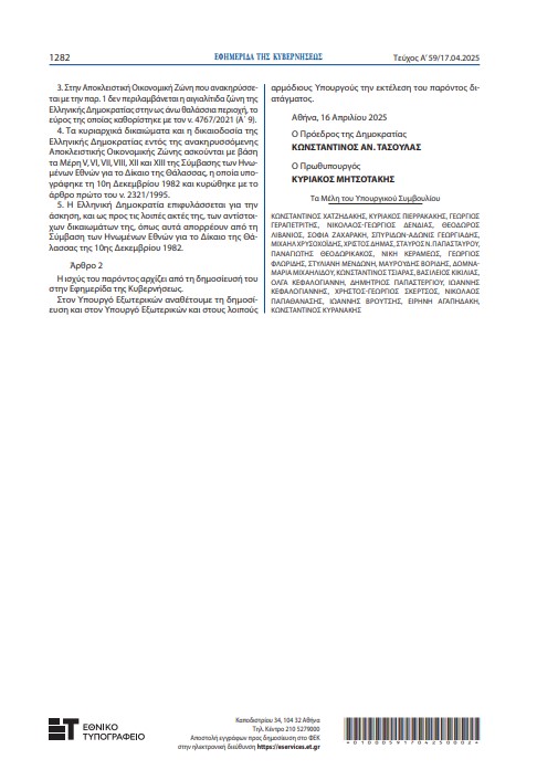 - Ανακηρύσσεται από την Ελληνική Δημοκρατία Αποκλειστική Οικονομική Ζώνη στη θαλάσσια περιοχή του Ιονίου, των Ιονίων Νήσων και μέχρι το Ακρωτήριο Ταίναρο της Πελοποννήσου.