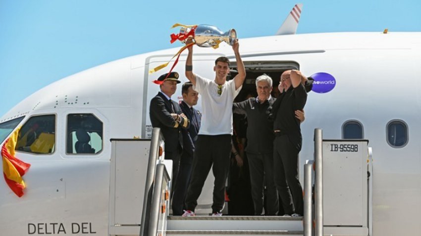 Με μαύρες φόρμες και άσπρες μπλούζες, οι Ισπανοί παίκτες και το επιτελείο επέστρεψαν στη χώρα λίγο πριν τις 16:30 (ώρα Ελλάδας), και φωτογραφήθηκαν με το τρόπαιο του Euro που κατέκτησαν κερδίζοντας (2-1) την Αγγλία την Κυριακή στο Βερολίνο, μπροστά από τη σκάλα του αεροπλάνου τους.
