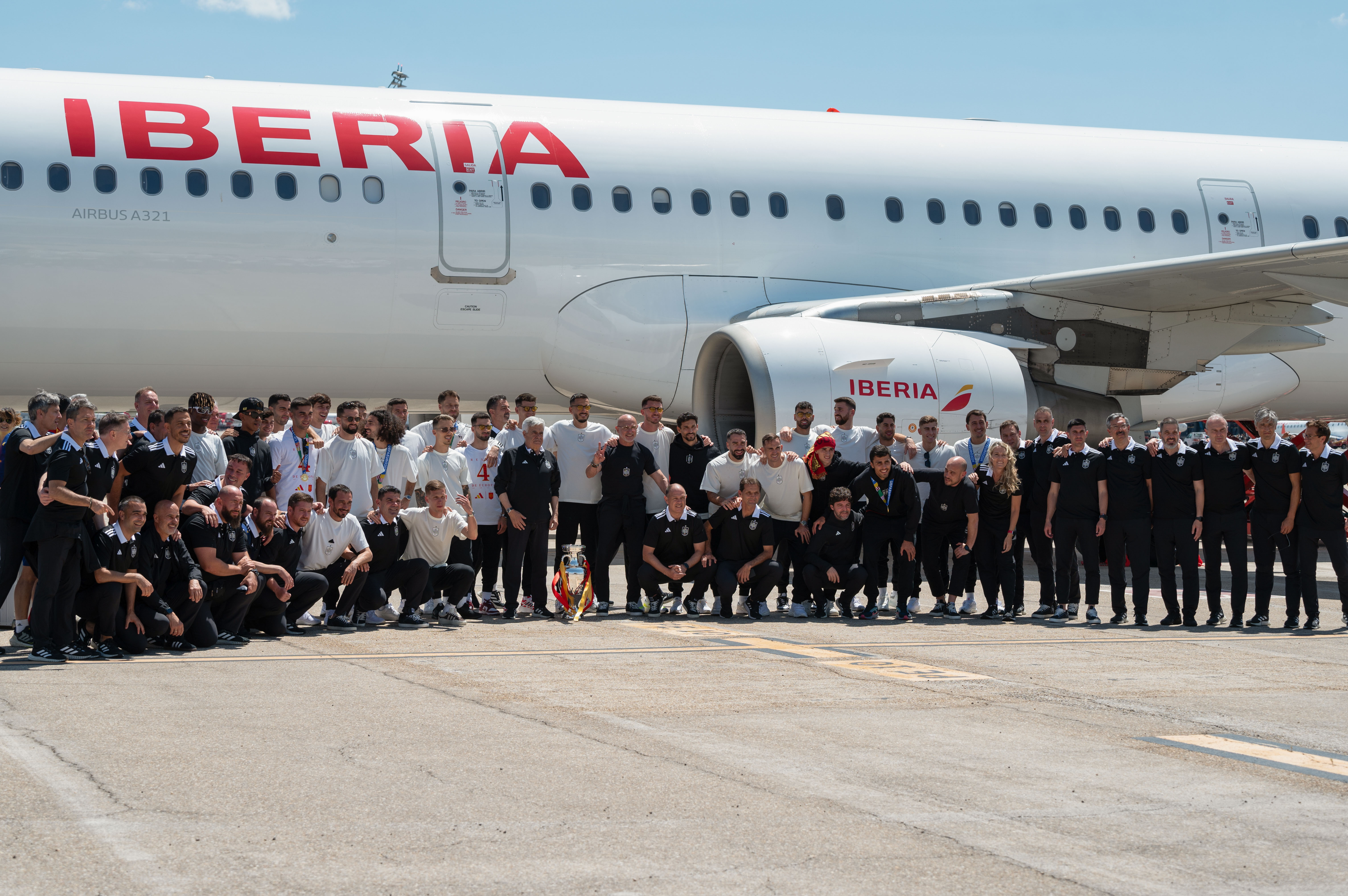 Με μαύρες φόρμες και άσπρες μπλούζες, οι Ισπανοί παίκτες και το επιτελείο επέστρεψαν στη χώρα λίγο πριν τις 16:30 (ώρα Ελλάδας), και φωτογραφήθηκαν με το τρόπαιο του Euro που κατέκτησαν κερδίζοντας (2-1) την Αγγλία την Κυριακή στο Βερολίνο, μπροστά από τη σκάλα του αεροπλάνου τους.