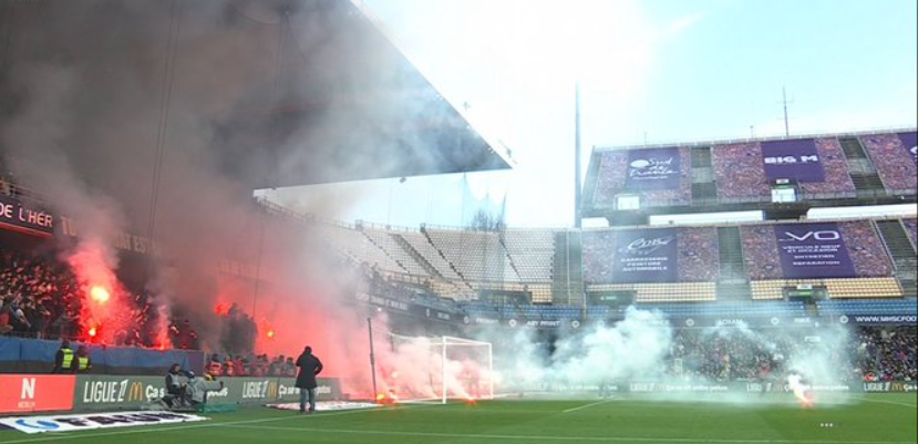 Αμέσως μετά το 0-2 απ’ τον Στασίν οι οπαδοί της Μονπελιέ άρχισαν να ανάβουν καπνογόνα και τα να πετούν στον αγωνιστικό χώρο, σε ένδειξη… διαμαρτυρίας για τη διαφαινόμενη ήττα της ομάδας τους και τον επερχόμενο υποβιβασμό (βρίσκεται εδώ και καιρό στην τελευταία θέση).