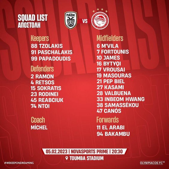 Συγκεκριμένα, στην αποστολή του Ολυμπιακού μετέχουν οι: Τζολάκης, Πασχαλάκης, Παπαδούδης, Ραμόν, Ρέτσος, Παπασταθόπουλος, Ροντινέι, Ρέαμπτσιουκ, Ντόη, Εμβιλά, Φορτούνης, Χάμες Ρομντρίγκες, Μπουτούτσι, Βρουσάι, Μασούρας, Μπιέλ, Κασάμι, Βαλμπουενά, Χουάνγκ, Σαμασέκου, Κανός, Ελ Αραμπί, Μπακαμπού.