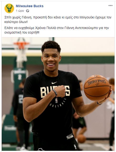 Ο Γιάννης Αντετοκούνμπο έχει την ονομαστική του εορτή και οι Μπακς δεν έχασαν την ευκαιρία να του ευχηθούν σε άπταιστα ελληνικά μέσω της σελίδας τους στο Facebook.