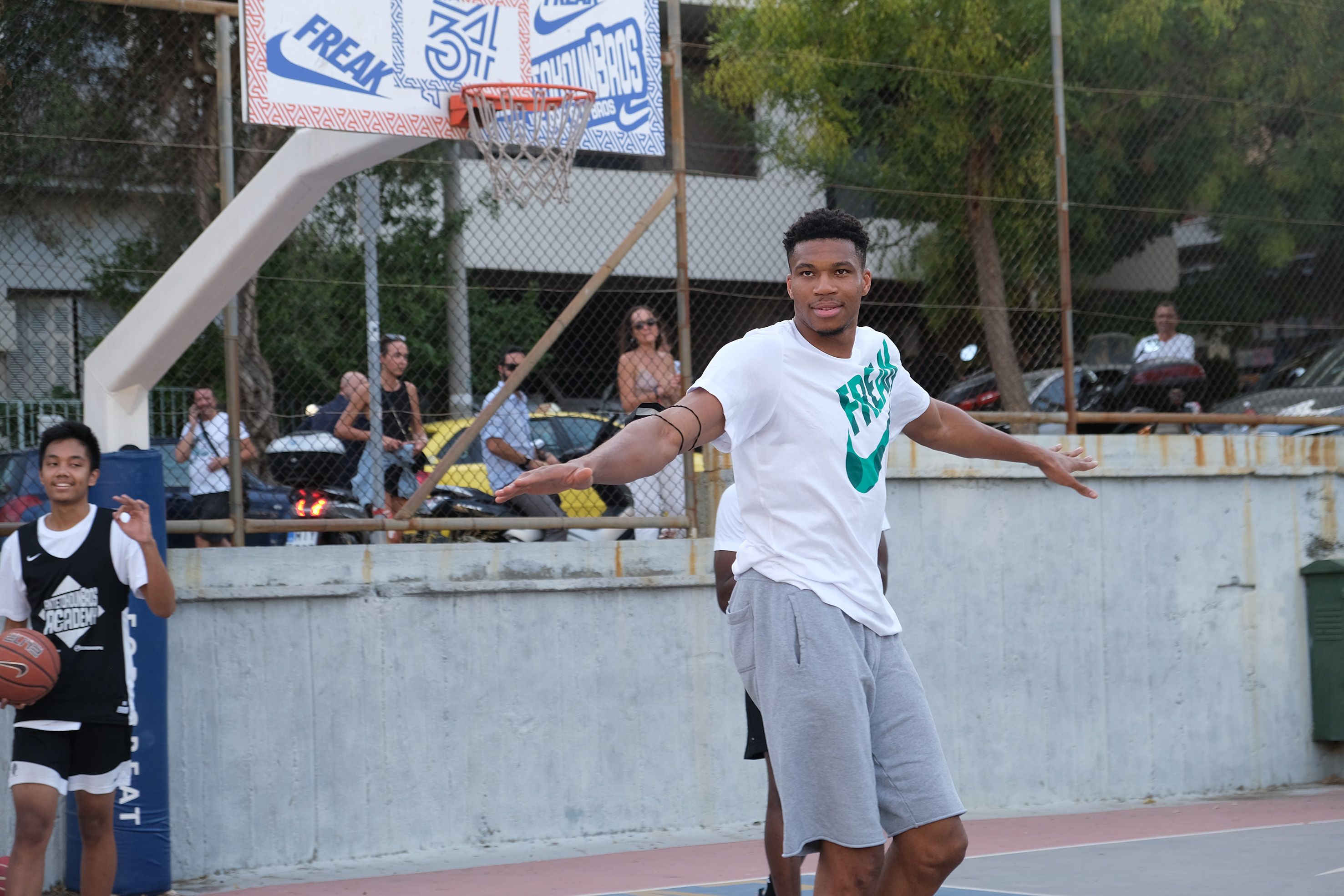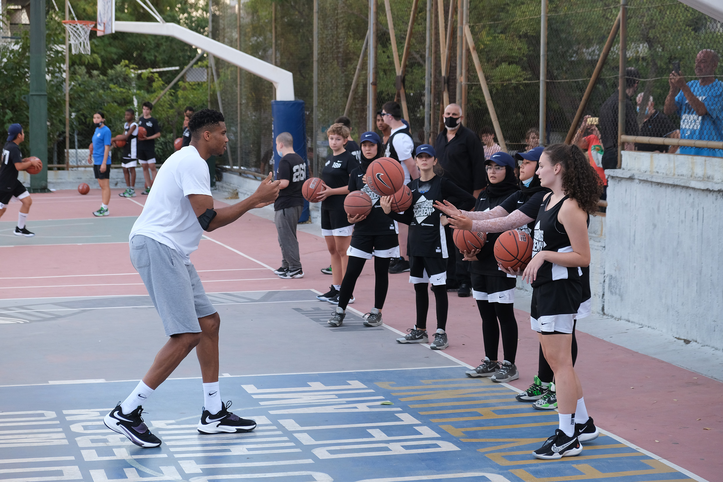 Στο ανοιχτό γήπεδο των Ελληνορώσων με το ξεχωριστό graffiti για τον Greek Freak, η Head Coach, Εβίνα Μάλτση, υποδέχθηκε τις νεαρές αθλήτριες και τους νεαρούς αθλητές που ξεκίνησαν προπόνηση πέρυσι, για μια συνάντηση-«έκπληξη» με τον Γιάννη και τον Άλεξ Αντετοκούνμπο. Ο εμπνευστής της AntetokounBros Academy, που υποστηρίζεται από τη Nike σε συνεργασία με το Ίδρυμα Ωνάση και τον Οργανισμό Eurohoops, συνάντησε για πρώτη φορά τα παιδιά για τα οποία εκείνος και τα αδέρφια του δημιούργησαν αυτή την ακαδημία, για ένα παιχνίδι που θα τους έμενε αξέχαστο. Ο Γιάννης και Άλεξ διάλεξαν τυχαία από δύο «συμπαίκτες» και έτσι ξεκίνησε το παιχνίδι. Αυτό βέβαια ήταν μόνο ένα μικρό «ζέσταμα», αφού αμέσως μετά ο Γιάννης έδωσε το σύνθημα και όλα τα παιδιά κατέβηκαν αμέσως στα γήπεδα, δίπλα στους προπονητές τους. Αυτή τη φορά, όμως, είχαν και τις οδηγίες του κορυφαίου παίκτη στον κόσμο.