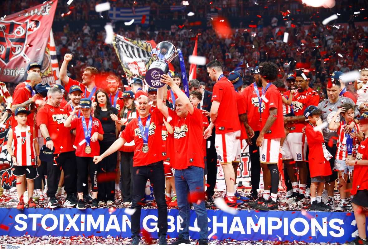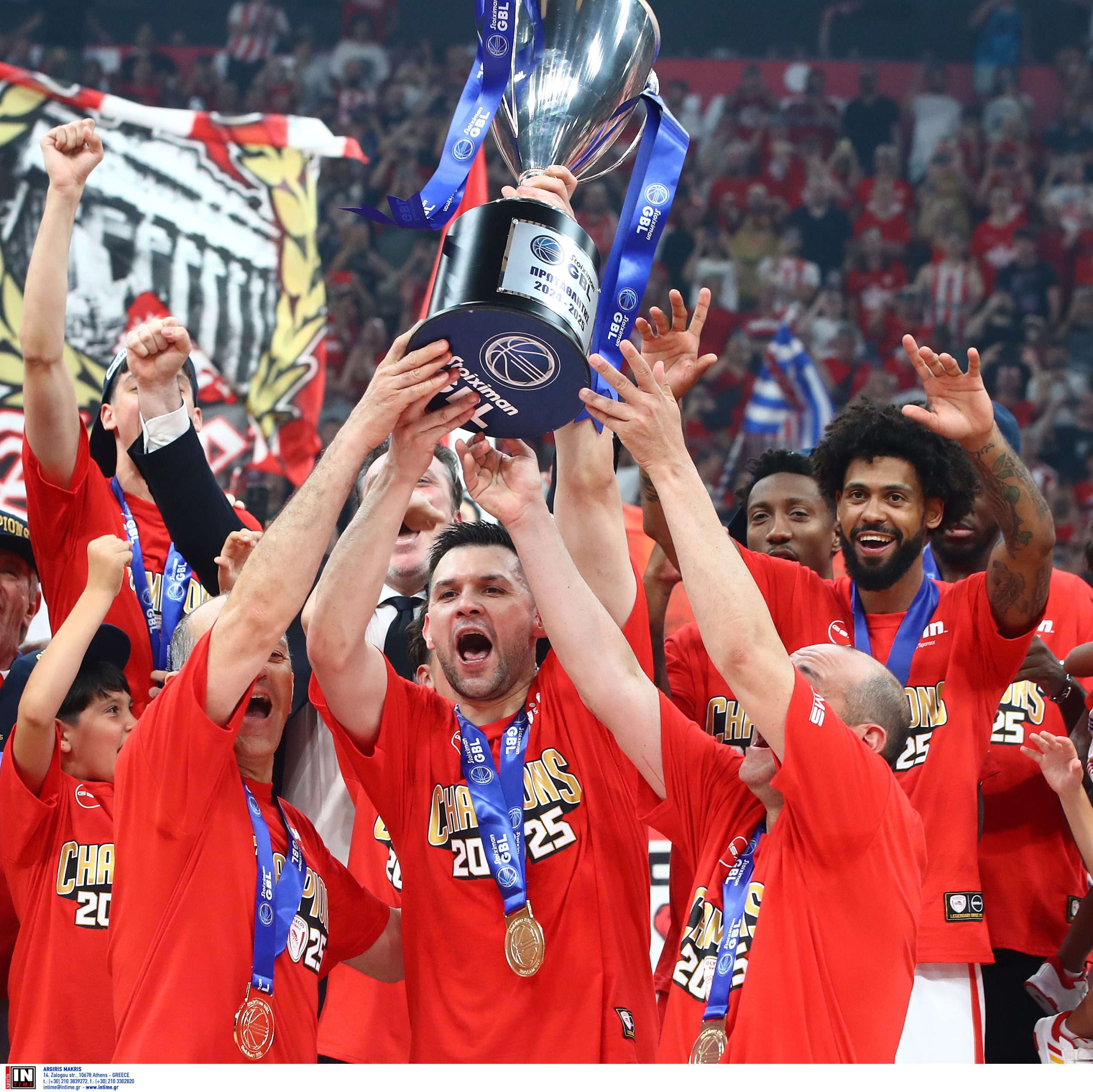 Σε μία μαγική ατμόσφαιρα, ο αρχηγός του Ολυμπιακού, Κώστας Παπανικολάου και οι διοικητικοί ηγέτες του Ολυμπιακού αδελφοί Αγγελόπουλοι, Παναγιώτης και Γιώργος, σήκωσαν από κοινού το τρόπαιο του πρωταθλητή Ελλάδας 2025 στον ουρανό του ΣΕΦ.