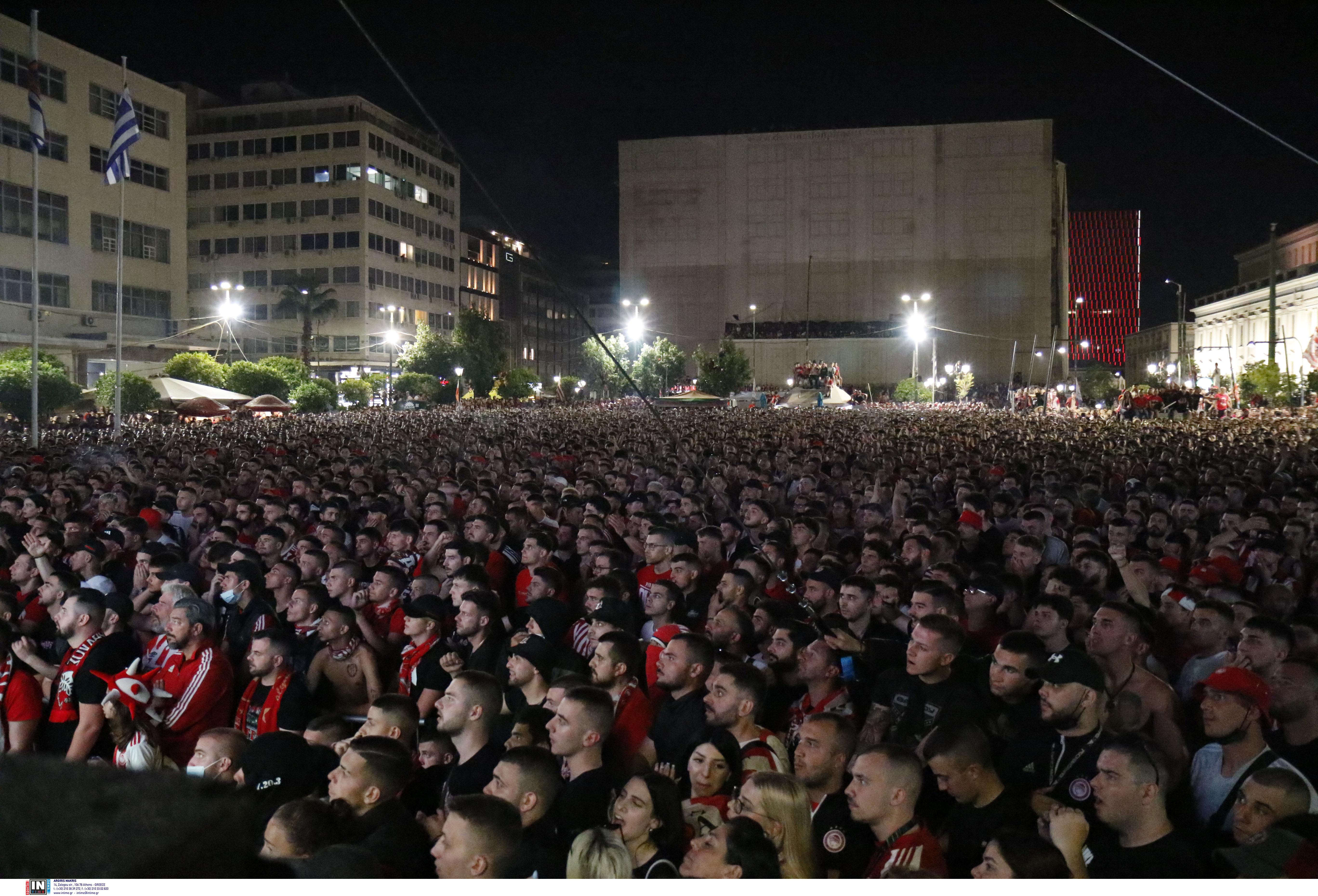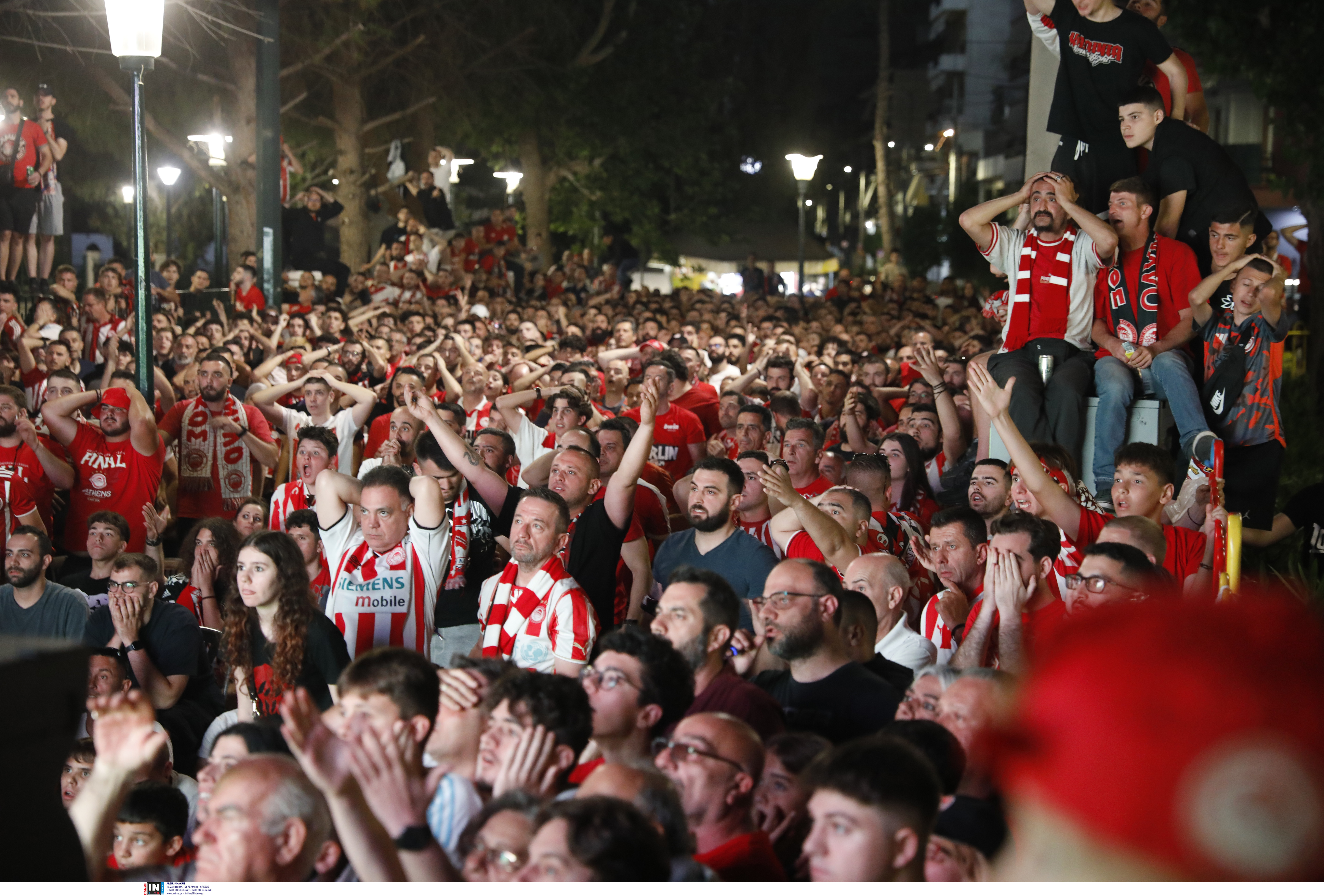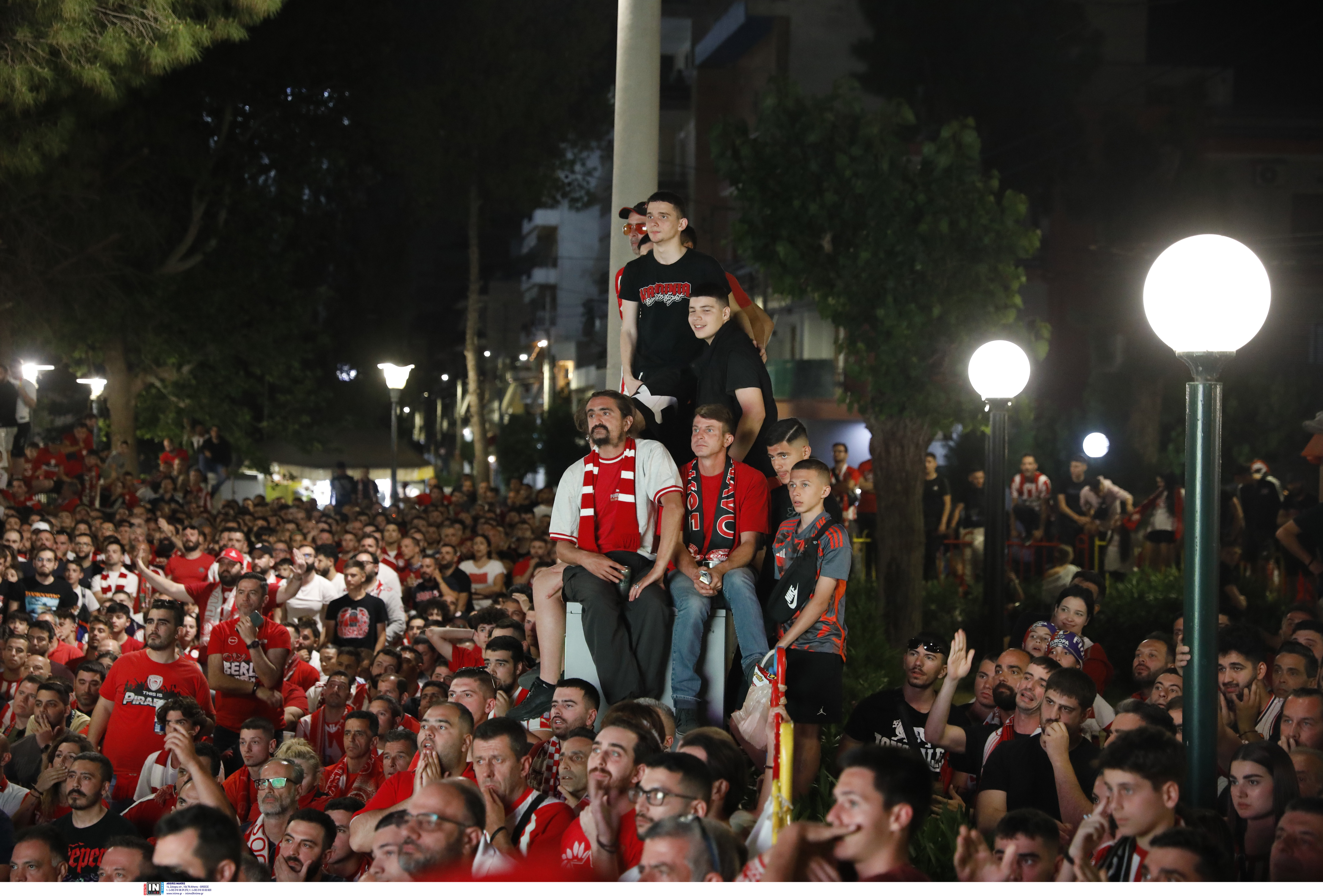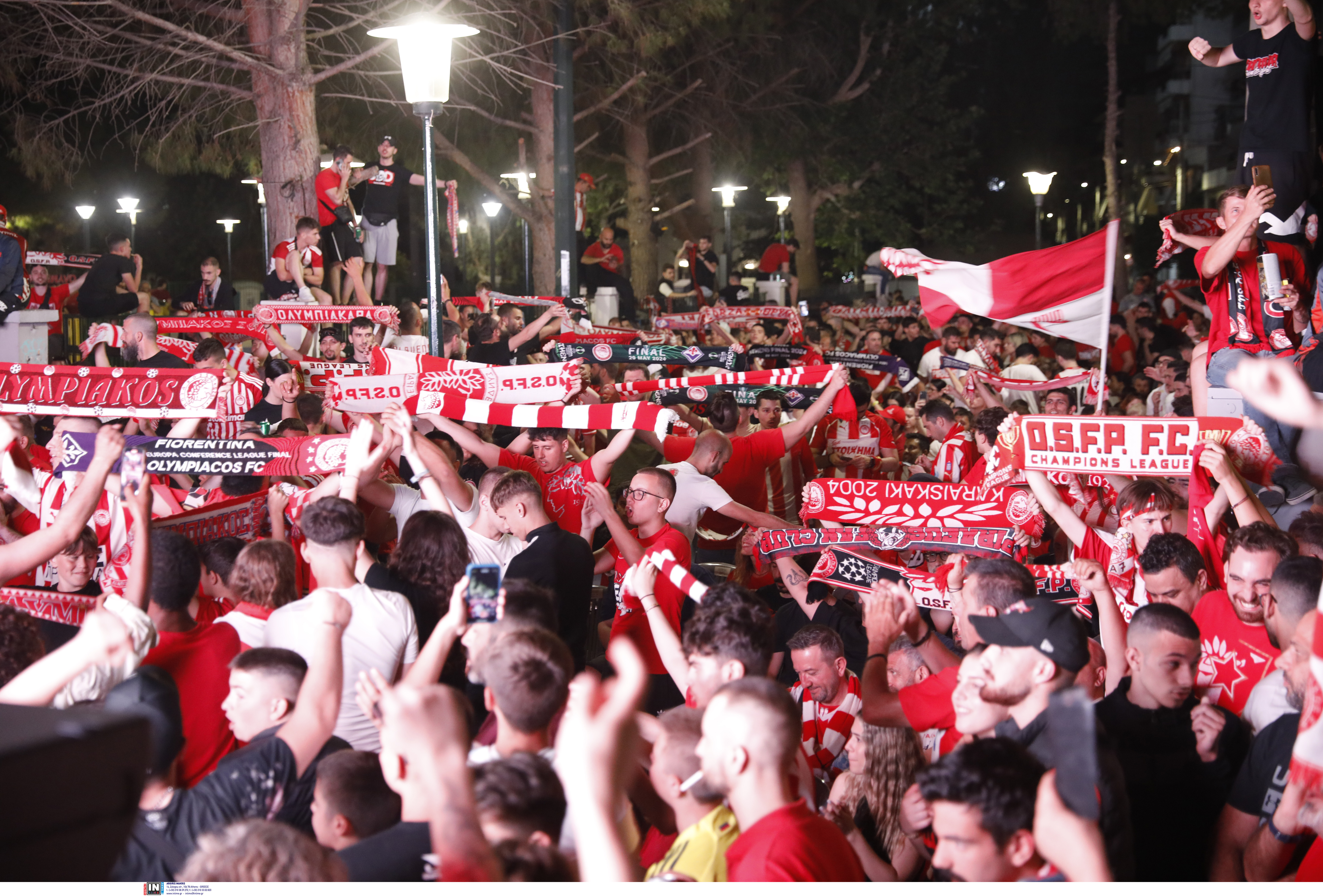 Χιλιάδες οπαδοί του Ολυμπιακού συγκεντρώθηκαν στο κέντρο του Πειραιά για να παρακολουθήσουν τον τελικό του Conference League κόντρα στη Φιορεντίνα στη γιγαντοοθόνη που έχει στηθεί στην πλατεία Κοραή.