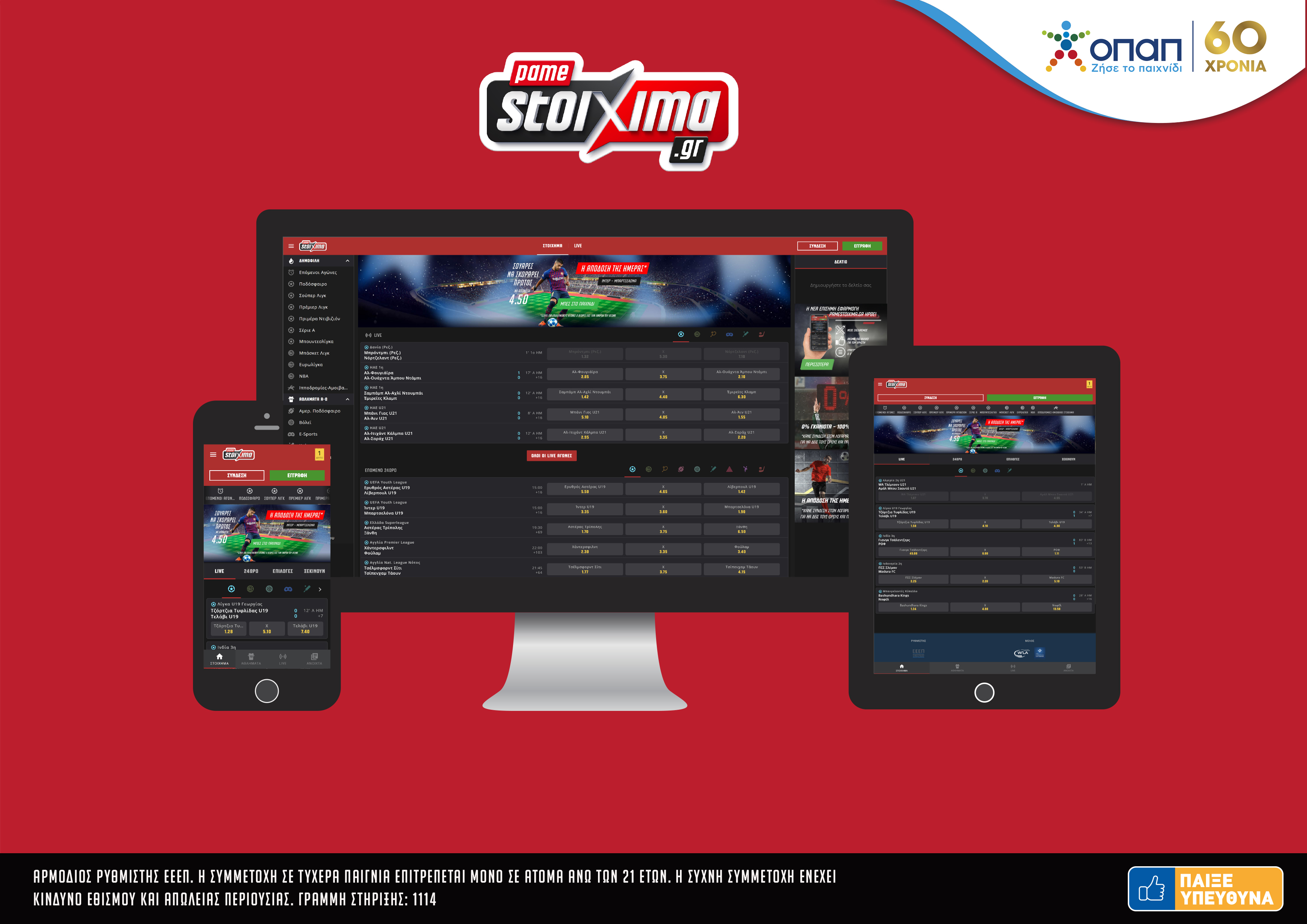 Το νέο Pamestoixima.gr είναι διαθέσιμο και μέσω εφαρμογής (app) για κινητά και tablet δίνοντας τη δυνατότητα στους παίκτες να ενημερωθούν και να επιλέξουν εύκολα και γρήγορα όλες τις διαθέσιμες στοιχηματικές επιλογές, όπου και αν βρίσκονται.