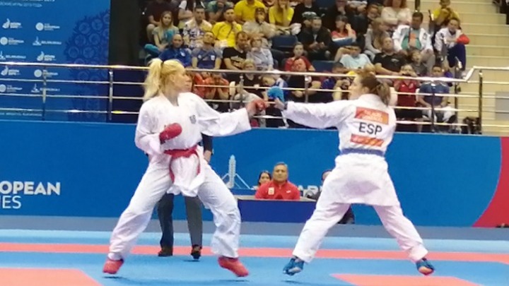 Το ένατο μετάλλιο ήρθε από το καράτε και την Ελένη Χατζηλιάδου, η οποία κατέκτησε το χάλκινο, μετά από συγκλονιστική προσπάθεια, λόγω ενοχλήσεων στο πόδι. Η Ελληνίδα πρωταθλήτρια στην κατηγορία των 68κ. επικράτησε με 5-0 της Αντούνοβιτς (Σουηδία), με 1-0 της Φερακούτι (Ιταλία) και αναδείχθηκε ισόπαλη 0-0 με την Κέιτανεν (Φινλανδία). Στα ημιτελικά, όμως, είδε την Παλάθιο Γκονζάλεθ από την Ισπανία να παίρνει τη νίκη με 3-1 στα σημεία, στερώντας από την Χατζηλιάδου την ευκαιρία πρόκρισής της στον τελικό.