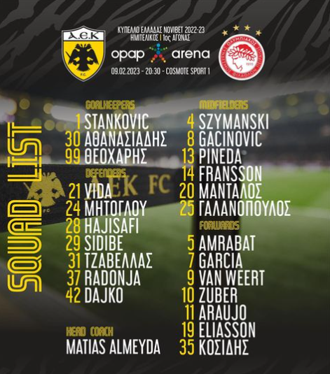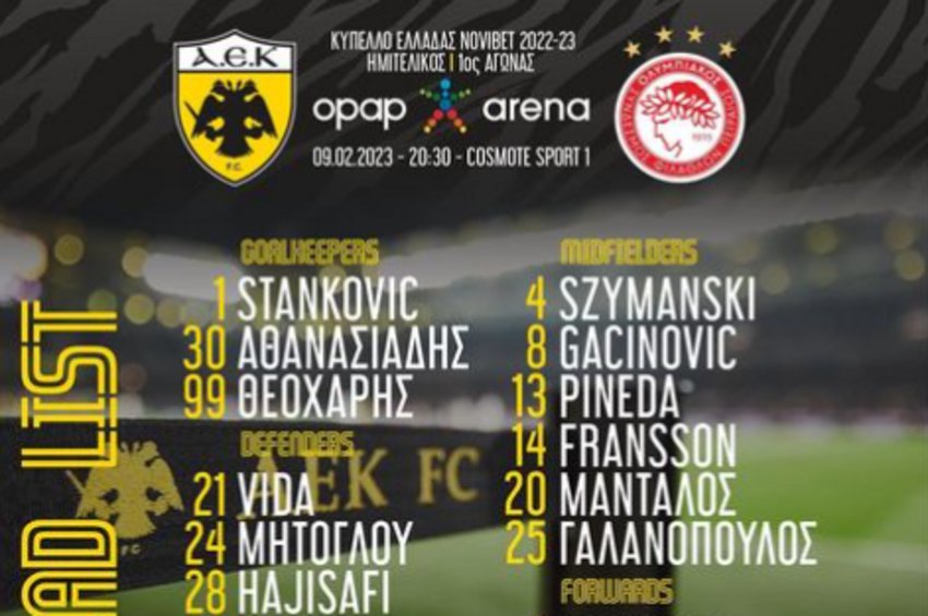 Αναλυτικά η αποστολή της ΑΕΚ: Στάνκοβιτς, Αθανασιάδης, Θεοχάρης, Βίντα, Μήτογλου, Χατζισαφί, Σιντιμπέ, Τζαβέλλας, Ραντόνια, Ντάικο, Σιμάνσκι, Γκατσίνοβιτς, Πινέδα, Φράνσον, Μάνταλος, Γαλανόπουλος, Άμραμπατ, Γαρσία, Φαν Βέερτ, Τσούμπερ, Αραούχο, Αλίασον, Κοσίδης.