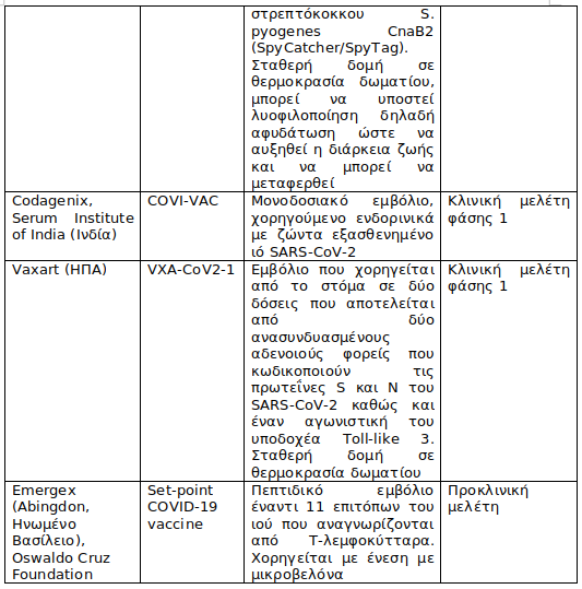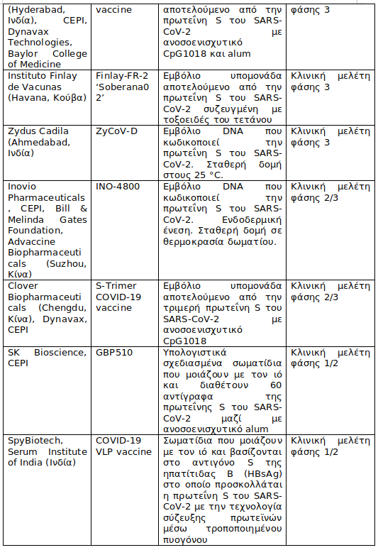 Η έγκριση του μονοδοσιακού εμβολίου της Johnson & Johnson μπορεί να επιταχύνει την αύξηση της παγκόσμιας πρόσβασης σε εμβόλια έναντι του SARS-CoV-2 και να προλάβει την ανάδυση νέων στελεχών σε χώρες μεσαίου και χαμηλού εισοδήματος. Λαμβάνοντας υπόψη την εμπειρία με άλλα λοιμώδη νοσήματα, οι εταιρείες παρασκευής εμβολίων έχουν ως στόχο την παραγωγή εμβολίων που προσφέρουν προστασία ενάντια σε διαφορετικά στελέχη. Επιπλέον, χρησιμοποιούν πολλές διαφορετικές τεχνικές όπως ζώντες εξασθενημένους ή αδρανοποιημένους ιούς, εμβόλια που χορηγούνται από το στόμα, εμβόλια που χορηγούνται ενδορινικά, εμβόλια που βασίζονται στο RNA με ενισχυμένη δράση, εμβόλια με σωματίδια που μοιάζουν με τον ιό, πεπτιδικά (πρωτεϊνικά) εμβόλια και εμβόλια RNA που στοχεύουν επιτόπους των Τ-λεμφοκυττάρων. Η εξασφάλιση θερμοσταθερότητας των εμβολίων είναι ιδιαίτερα σημαντική ιδιαίτερα για τη διανομή και τη συντήρησή τους σε χώρες με περιορισμένους πόρους. Η έκταση της αναπτυξιακής πλατφόρμας των εμβολίων διεθνώς είναι αξιοσημείωτη. Πέρα από τα εμβόλια που έχουν ήδη εγκριθεί από τις ρυθμιστικές αρχές, σε στάδιο κλινικής αξιολόγησης βρίσκονται 7 εμβόλια που βασίζονται στο DNA, 11 εμβόλια με αδρανοποιημένο ιό, 1 εμβόλιο με ζώντα εξασθενημένο ιό, 8 εμβόλια με ιικούς φορείς χωρίς ικανότητα πολλαπλασιασμού, 5 εμβόλια με ιικούς φορείς που έχουν δυνατότητα πολλαπλασιασμού, 19 εμβόλια υπομονάδες, 5 εμβόλια που βασίζονται στο mRNA και 2 εμβόλια που βασίζονται σε σωματίδια που μοιάζουν με τον ιό. Σημαντική είναι επίσης η ευρεία γεωγραφική κατανομή αυτών των προσπαθειών. Τα κυριότερα από τα εμβόλια που βρίσκονται υπό ανάπτυξη σε χώρες μέτριου και χαμηλού εισοδήματος συνοψίζονται στον Πίνακα.