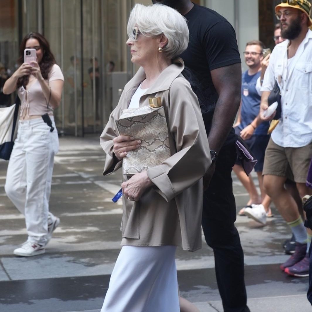 Η Meryl Streep επανέρχεται με iconic εμφάνιση στα γυρίσματα του The Devil Wears Prada 2, κρατώντας animal print τσάντα Jacquemus.