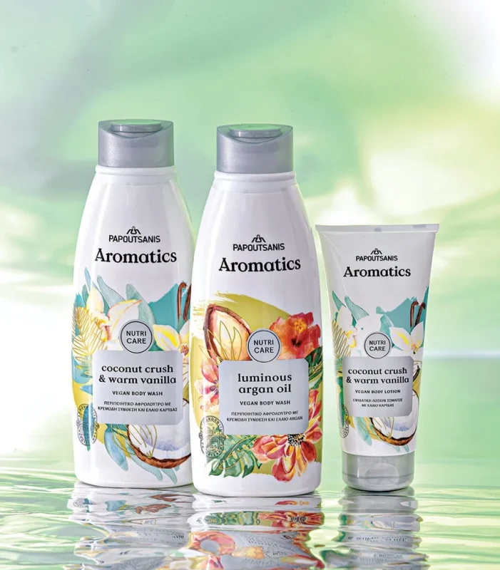 Στην αρχή ή στο τέλος μιας κουραστικής μέρας δεν υπάρχει τίποτα πιο αναζωογονητικό από ένα μπά νιο ή ντους μέσα σε αρωματισμένους αφρούς, και στη συνέχεια, περιποίηση της επιδερμίδας με ένα ενυδατικό προϊόν σώματος με άρωμα που σαγηνεύει και αφυπνίζει τις αισθήσεις. Η ανάγκη για βαθιά ενυδατωμένη και αρωματισμένη επιδερμίδα που διαρκεί όλη μέρα οδήγησε τη δημοφιλή εταιρεία Παπουτσάνης –με πολυετή τεχνογνωσία– να δημιουργήσει τη νέα vegan σειρά Aromatics Nutri Care.