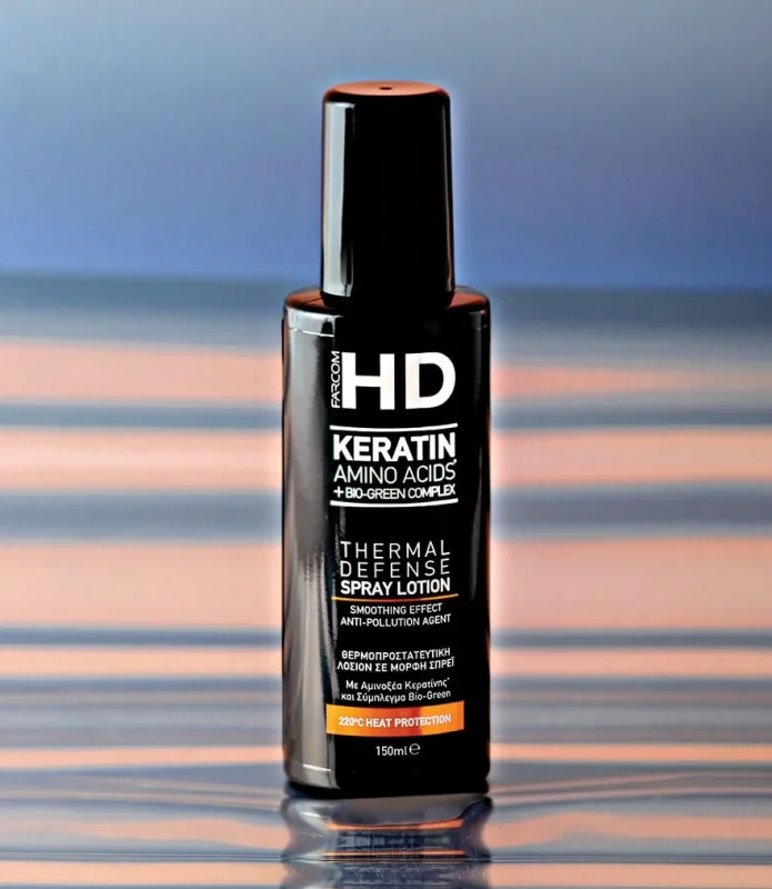 Η θερμοπροστατευτική λοσιόν σε μορφή σπρέι HD Thermal Defense Spray Lotion της Farcom συστήνεται σαν μια αποτελεσματική και ιδανική λύση για την προστασία των μαλλιών κατά τη χρήση θερμικών εργαλείων σε υψηλές θερμοκρασίες – έως και τους 220°C. Η σύνθεσή της είναι εμπλουτισμένη με αμινοξέα κερατίνης φυτικής προέλευσης και το καινοτόμο σύμπλεγμα Bio-Green, με οξέα φρούτων και εκχύλισμα πράσινου τσαγιού.