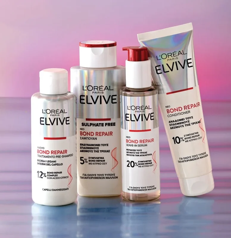 Εργαστηριακό τεστ μετά από 5 εφαρμογές Pre-Shampoo+Σαμπουάν+Conditioner, και εργαστηριακό τεστ μετά την εφαρμογή Pre-Shampoo+Σαμπουάν+Conditioner, έδειξε ότι η ολοκληρωμένη ρουτίνα Elvive Bond Repair της L’Oréal Paris επανορθώνει τα μαλλιά, επαναφέροντας την αρχική τους δύναμη και προσφέροντας έως και 98% λιγότερο σπάσιμο, 90% περισσότερη λάμψη και 82% πιο δυνατά μαλλιά. Τα προϊόντα της σειράς είναι κατάλληλα για όλους τους τύπους μαλλιών.