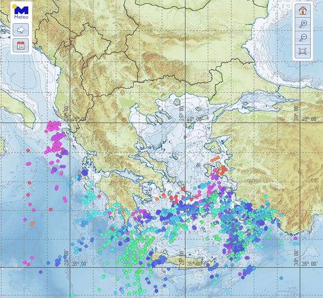Επίσης, περίπου 2000 κεραυνοί έχουν καταγραφεί από την αρχή της ημέρας κυρίως στις θαλάσσιες περιοχές του Κεντρικού και Νότιου Αιγαίου, αλλά και του Ιονίου, όπως κατεγράφησαν από το δίκτυο ανίχνευσης κεραυνών ΖΕΥΣ του Εθνικού Αστεροσκοπείου Αθηνών / meteo.gr και παρουσιάζονται στον παρακάτω Χάρτη.