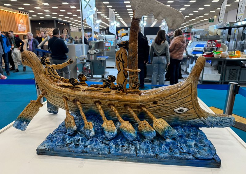Δίπλα του ακριβώς, βρίσκεται ένα εντυπωσιακό αρχαιοελληνικό καράβι που με δυσκολία κάποιος αντιλαμβάνεται πως είναι παρασκευασμένο με ζυμάρι. «Εδώ στο χώρο φιλοξενούμε και το καράβι του Οδυσσέα, όπου είναι δεμένος στο κατάρτι για τις Σειρήνες. Αυτό το είχα φτιάξει πριν από τέσσερα χρόνια στο Πανελλήνιο Πρωτάθλημα και αυτό μου έδωσε την πρόκριση στην εθνική ομάδα και καταφέραμε και φτάσαμε στο μεγαλύτερο διαγωνισμό που είναι το Παγκόσμιο Πρωτάθλημα αρτοποιίας που γίνεται κάθε δύο χρόνια στο Παρίσι. Πριν από ένα μήνα, πήραμε την έβδομη θέση παγκοσμίως και τώρα βρισκόμαστε εδώ στο 6ο Πρωτάθλημα Αρτοποιίας που γίνεται κάθε δύο χρόνια στη Θεσσαλονίκη και περιμένουμε να βγούνε οι καλύτερες ομάδες, οι οποίες θα αποτελέσουν τη δική μας συνέχεια» υπογραμμίζει.