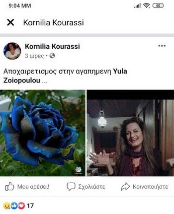 «Σκοτεινή μέρα η σημερινή αλλά και παγκόσμια ημέρα αγάπης συνάμα… Τώρα ξαστέρωσε κ χτυπούν οι καμπάνες… παραμονή του Αγ. Ελευθερίου… Ελευθερώνονται και αναπαύονται οι ψυχές… Ας αναπαυτεί η ψυχούλα σου, Γιούλα…», έγραψε η Μαρία Κίτσου.