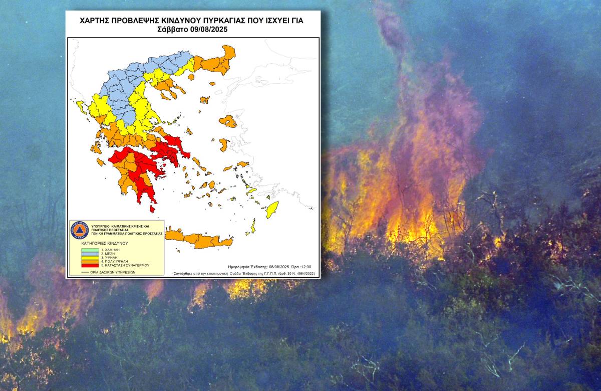 Aκραίος κίνδυνος πυρκαγιάς – Κατάσταση Συναγερμού (κατηγορία κινδύνου 5) προβλέπεται αύριο σε Αττική και περιοχές της Στερεάς Ελλάδας, της Πελοποννήσου και της Δυτικής Ελλάδας, σύμφωνα με τον Χάρτη Πρόβλεψης Κινδύνου Πυρκαγιάς που εκδίδει η Γενική Γραμματεία Πολιτικής Προστασίας του υπουργείου Κλιματικής Κρίσης και Πολιτικής Προστασίας (civilprotection.gov.gr).