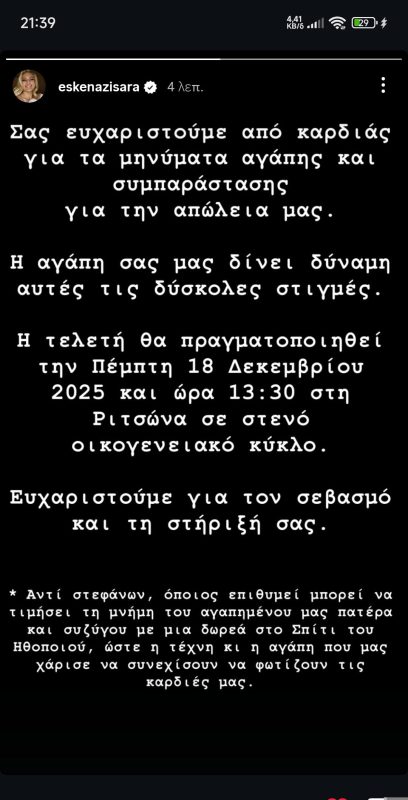 Το τελευταίο αντίο θα πουν στον Αλμπέρτο Εσκενάζυ συγγενείς, φίλοι και συνάδελφοί του το μεσημέρι της Πέμπτης 18 Δεκεμβρίου στο Αποτεφρωτήριο Ριτσώνας.