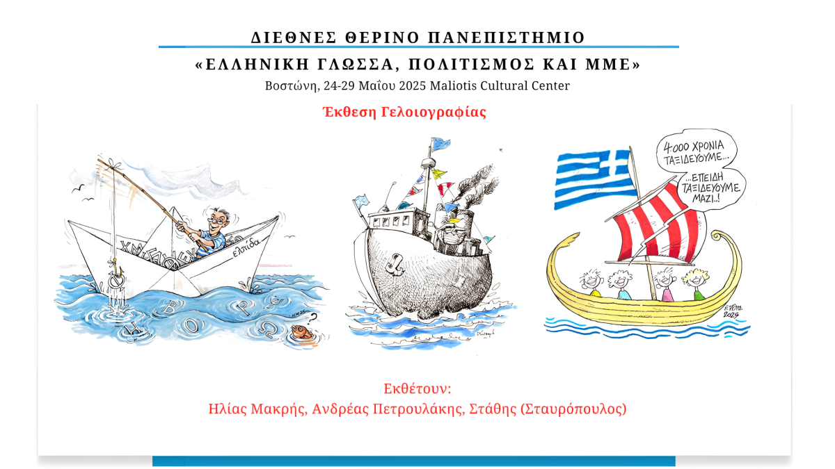 Το Διεθνές Θερινό Πανεπιστήμιο θα φιλοξενήσει επίσης έκθεση σκίτσων 3 διακεκριμένων Ελλήνων σκιτσογράφων, των Ηλία Μακρή, Ανδρέα Πετρουλάκη, Στάθη Σταυρόπουλου, μια ελληνική «νηοπομπή» που θα ξεκινήσει από το Πανεπιστήμιο Ιωαννίνων και θα διασχίσει τον Ατλαντικό για να απευθυνθεί στη διασπορά. Το πρόγραμμα θα παρουσιαστεί σε ειδική εκδήλωση στο Μουσείο Μπενάκη στην Αθήνα, την Τρίτη 29 Απριλίου και ώρα 7 το απόγευμα.