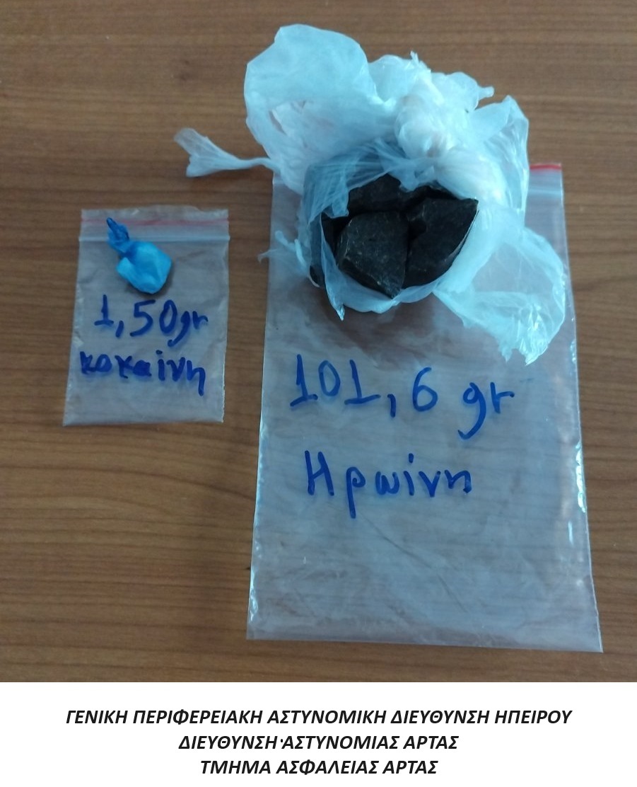 Στον έλεγχο που επακολούθησε, βρέθηκαν στο σακίδιο πλάτης που έφερε και κατασχέθηκαν δύο συσκευασίες, που περιείχαν 101,6 γραμμάρια ηρωίνης και 1,5 γραμμάρια κοκαΐνης, αντίστοιχα.