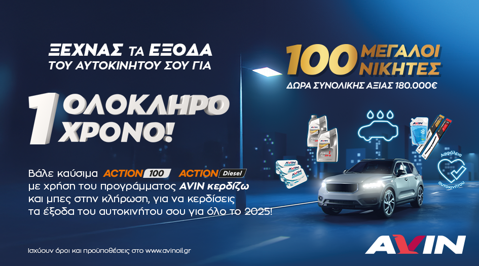 Από 1 Δεκεμβρίου έως 7 Ιανουαρίου, με κάθε ανεφοδιασμό 20λτ καυσίμων ACTION από τα πρατήρια AVIN που συμμετέχουν στην ενέργεια και με τη χρήση του Προγράμματος AVIN Κερδίζω, οι πελάτες συμμετέχουν αυτόματα σε κλήρωση, για να κερδίσουν τα έξοδα του αυτοκινήτου τους για όλο το 2025.