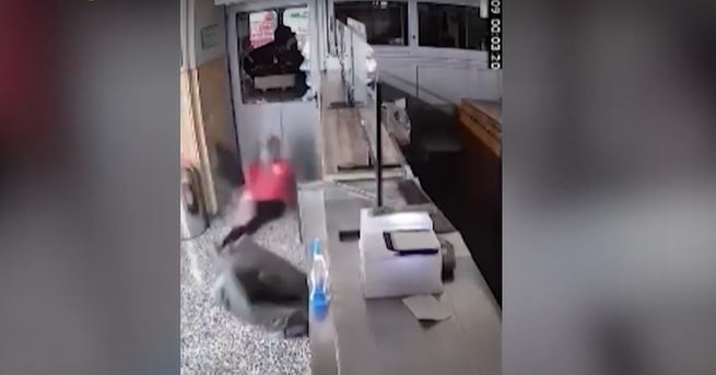 Στη βιασύνη του «τρώει» τούμπα και του πέφτει το κινητό μέσα στο κατάστημα. Ωστόσο, δεν το καταλαβαίνει και το αφήνει εκεί.