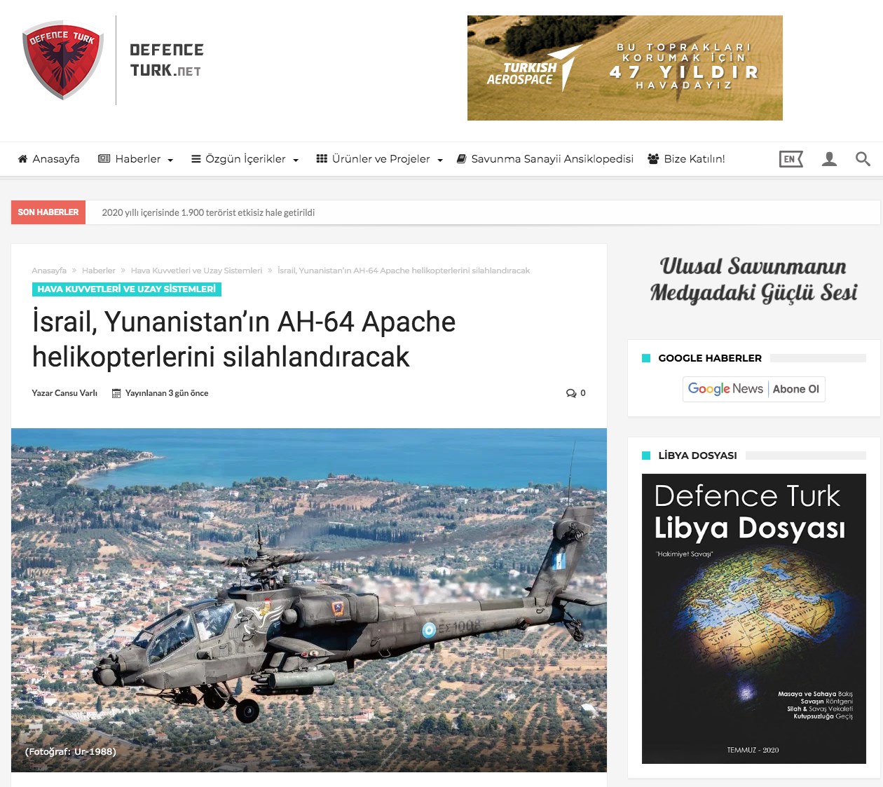 Η τουρκική ιστοσελίδα που ασχολείται με θέματα άμυνας, defenceturk αναφέρεται εκτενώς σε δημοσίευμα της στο θέμα αναβάθμισης των 19 ελικοπτέρων Apache πρώτης γενιάς που έχει η Ελλάδα, με ισραηλινά συστήματα έναντι 35 εκατ. ευρώ.Πριν από καιρό είχαμε αποκαλύψει στο enikos.gr το σενάριο συνεργασίας με τους Ισραηλινούς στο θέμα αναβάθμισης των επιθετικών ελικοπτέρων Apache AH-64A σε επίπεδο εφάμιλλο των D, με ισραηλινής σχεδίασης συστήματα. Πλέον φαίνεται ότι αυτή η συνεργασία βρίσκεται σε προχωρημένο στάδιο, με τους Τούρκους να επικαλούνται ελληνικά δημοσιεύματα και να εκφράζουν ανοιχτά τον προβληματισμό τους – αν όχι τρόμο – για τις νέες ισορροπίες που διαμορφώνονται.