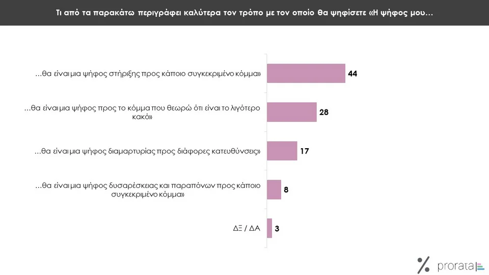 Σύμφωνα με τα ευρήματα της έρευνας, περίπου 7 στους 10 θα ψηφίσουν με γνώμωνα τα θέματα που αφορούν το εσωτερικό της χώρας, ενώ μόλις 3 στους 10 τα ευρωπαϊκά ζητήματα. Παράλληλα, το 44% δηλώνει ότι στις επικείμενες ευρωεκλογές θα ψηφίσει για να δηλώσει την υποστήριξη του προς κάποιο συγκεκριμένο κόμμα, το 28% πως θα ψηφίσει το κόμμα που θεωρεί πως αποτελεί το “λιγότερο κακό”, το 8% ότι θα ψηφίσει εκφράζοντας δυσαρέσκεια και παράπονα προς κάποιο συγκεκριμένο κόμμα, ενώ το 17% πως θα ψηφίσει, διαμαρτυρόμενο προς διάφορες κατευθύνσεις.
