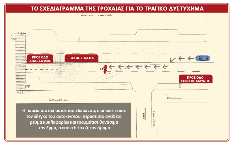 Τα μοιραία δευτερόλεπτα, όταν το αυτοκίνητο ξέφυγε από την πορεία του και χτύπησε τη νεαρή φοιτήτρια που διέσχιζε την οδό Εγνατία, αποτυπώνονται στο σχεδιάγραμμα της Τροχαίας, το οποίο αποκαλύπτει η Reanews. Οπως φαίνεται με σαφήνεια στην εικόνα που δημοσιεύεται, ο 26χρονος οδηγός έχασε τον έλεγχο του αυτοκινήτου, με αποτέλεσμα αυτό να ολισθήσει, να περάσει στο αντίθετο ρεύμα κυκλοφορίας και να παρασύρει την άτυχη Εμμα. Σύμφωνα με τα πρώτα επίσημα στοιχεία της Τροχαίας, ο οδηγός λόγω υπερβολικής ταχύτητας δεν κατάφερε να αντιδράσει και να επανακτήσει τον έλεγχο του οχήματός του.