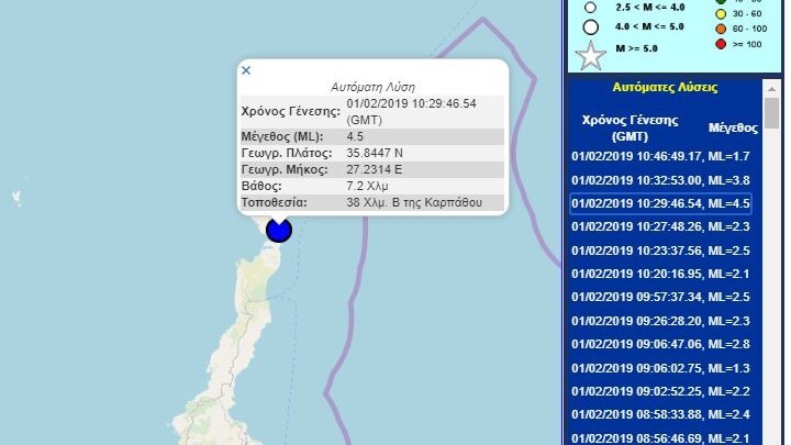 Δύο σεισμοί ταρακούνησαν την Κάρπαθο. Ο πρώτος σεισμός που σημειώθηκε ήταν μεγέθους 4,5 βαθμών της κλίμακας Ρίχτερ – και όχι 4,1 Ρίχτερ όπως αρχικά είχε υπολογιστεί – με επίκεντρο 38 χλμ βόρεια της Κάρπαθου και εστιακό βάθος 7,2 χλμ.