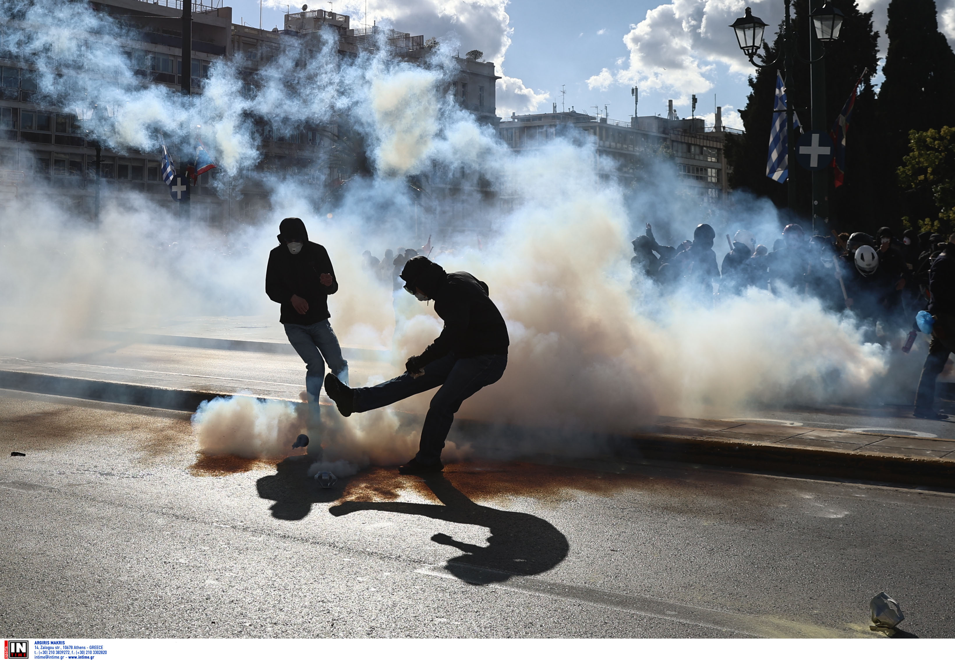Στην συνέχεια η ένταση μεταφέρθηκε στην κάτω πλευρά της πλατείας Συντάγματος όπου ομάδα ΔΙΑΣ δέχθηκε επίθεση με πέτρες από αγνώστους στην οδό Ερμού, ενώ κουκουλοφόροι έβαλαν φωτιές σε κάδους απορριμμάτων στην συμβολή των οδών Μητροπόλεως και Φιλελλήνων, προκαλώντας παράλληλα υλικές ζημίες σε καταστήματα.