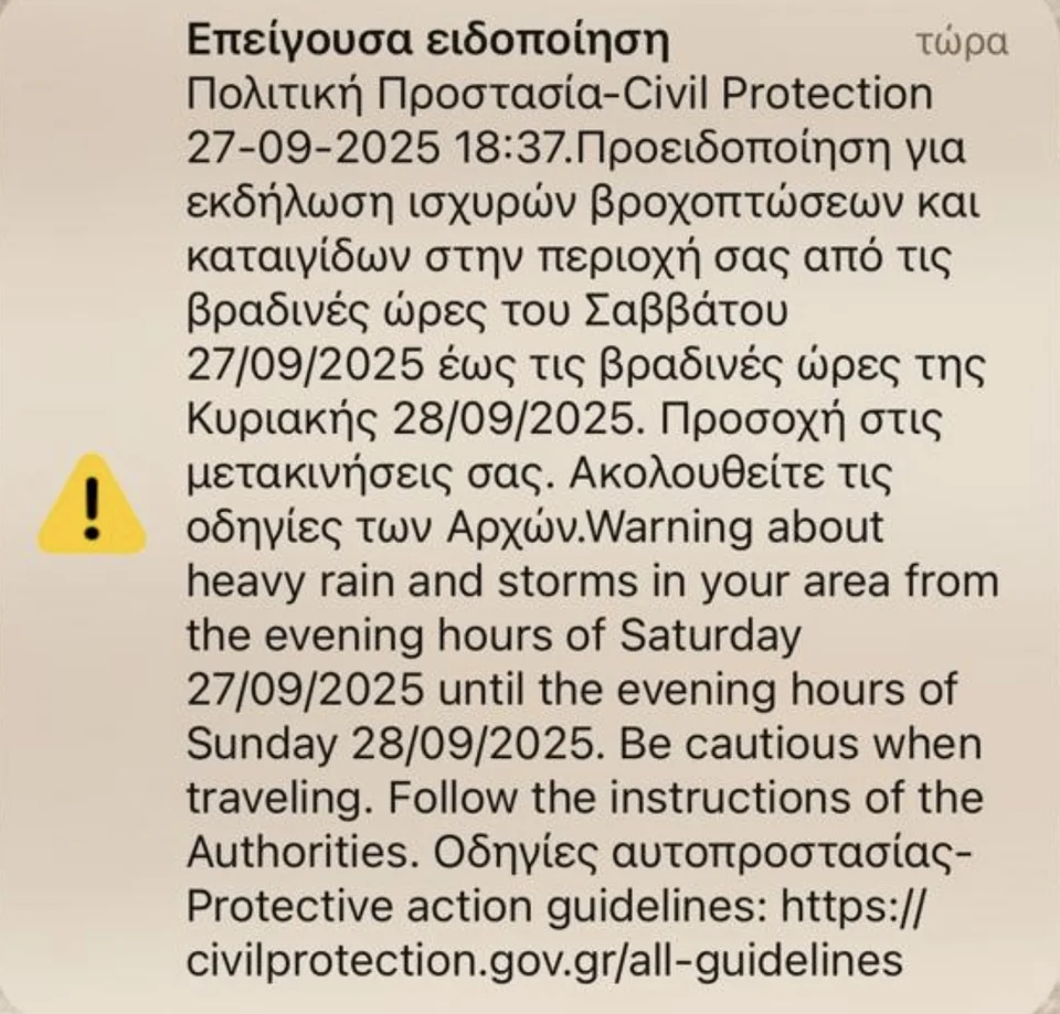 «Προειδοποίηση για εκδήλωση ισχυρών βροχοπτώσεων και καταιγίδων στην περιοχή σας από τις βραδινές ώρες του Σαββάτου 27/09/2025 έως τις βραδινές ώρες της Κυριακής 28/09/2025. Προσοχή στις μετακινήσεις σας. Ακολουθείτε τις οδηγίες των αρχών».