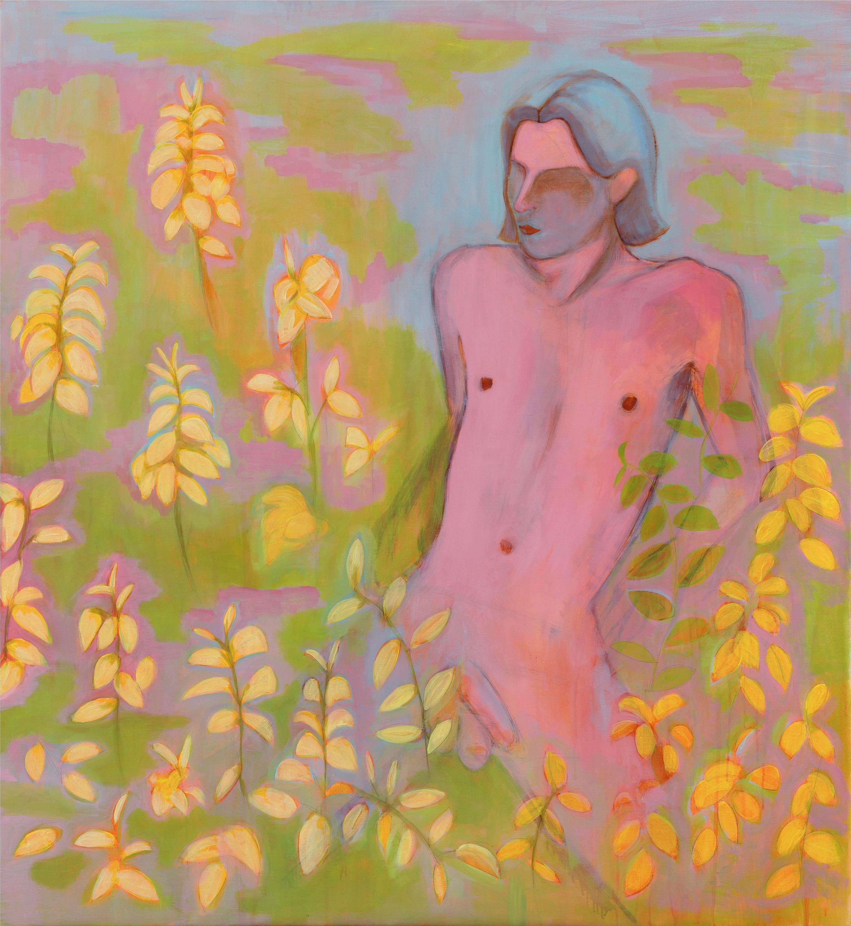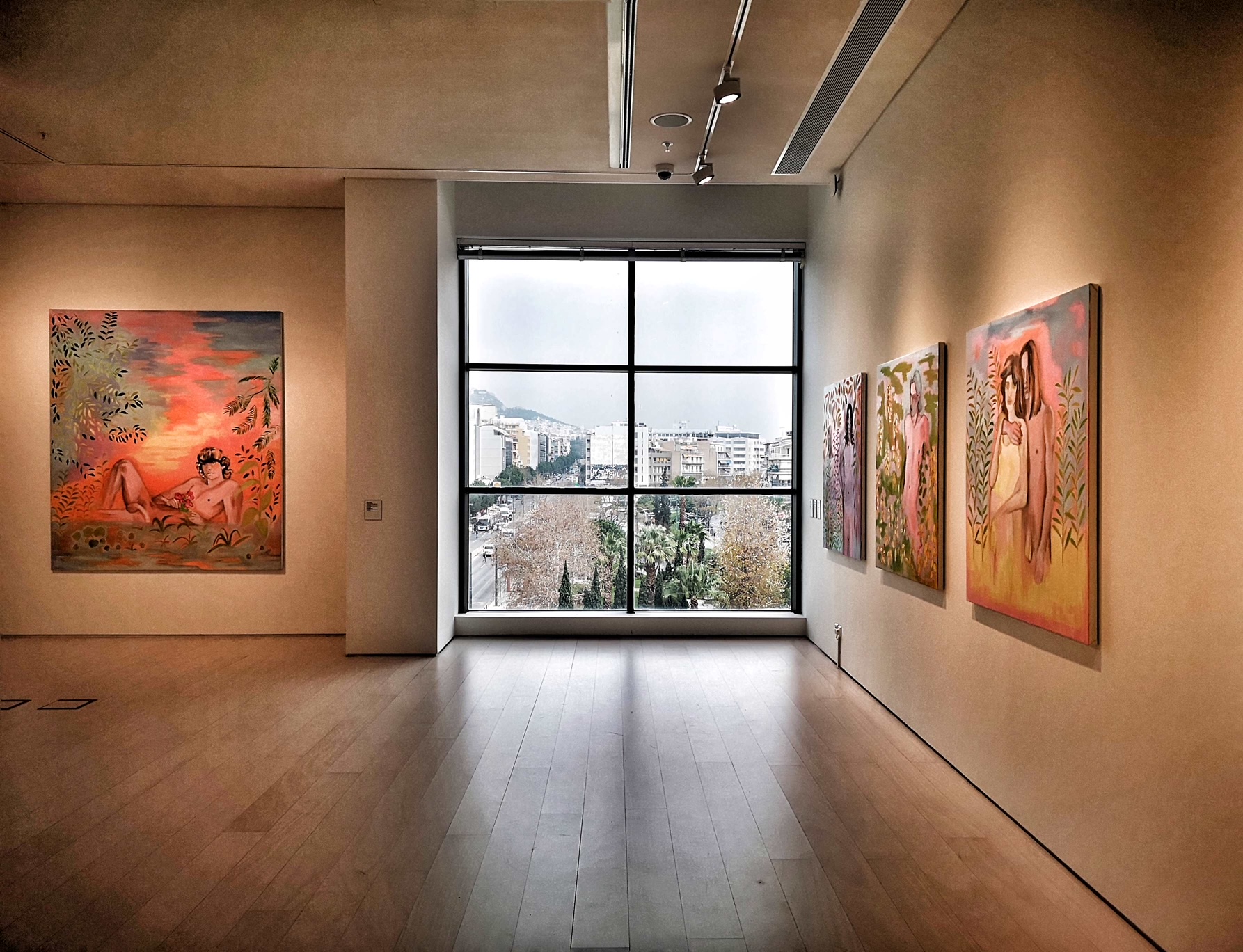 Η ευρύχωρη, φωτεινή αίθουσα του Εθνικού Μουσείου Σύγχρονης Τέχνης που φιλοξενεί, μέχρι τις 7 Μαΐου, την έκθεση της Ελένης Μπαγάκη “Something like a poem, a nude and flowers in a vase”, σε επιμέλεια της Τίνα Πανδή, θυμίζει πάρκο. Το αστικό τοπίο αναδύεται αγέρωχο στο βάθος, μέσα από τα μεγάλα παράθυρα. Οι πίνακες κολυμπούν ανάλαφρα στα παστέλ χρώματα του ηλιοβασιλέματος. Σε μια ολόκληρη πλευρά υπάρχουν πάγκοι, στους οποίους οι νεαροί επισκέπτες της έκθεσης κάθονται, φορούν τα ακουστικά που παρέχονται για να ακούσουν τα μελοποιημένα ποιήματα της Ελένης, συζητούν χαμηλόφωνα. Άλλοι φωτογραφίζονται μπροστά στα έργα, που απεικονίζουν γυμνά αγόρια στη φύση, ένα βιβλίο ανοιγμένο επάνω σε χορτάρια και λουλούδια, μια σύνθεση από σελίδες ερωτικών περιοδικών των ΄70’ς, πάνω στις οποίες η καλλιτέχνις έχει δημιουργήσει. Η ατμόσφαιρα αποπνέει την ομορφιά και τη γαλήνη που η Ελένη Μπαγάκη συνδέει με τη δύση του ηλίου- “μια μεταβατική, μαγική ώρα, στην οποία, ακόμα και στην Ομόνοια να βρίσκεσαι, όλα από γκρί γίνονται ροζ. Είναι η στιγμή της ημέρας που συνειδητοποιείς πώς περνάει ο χρόνος”.