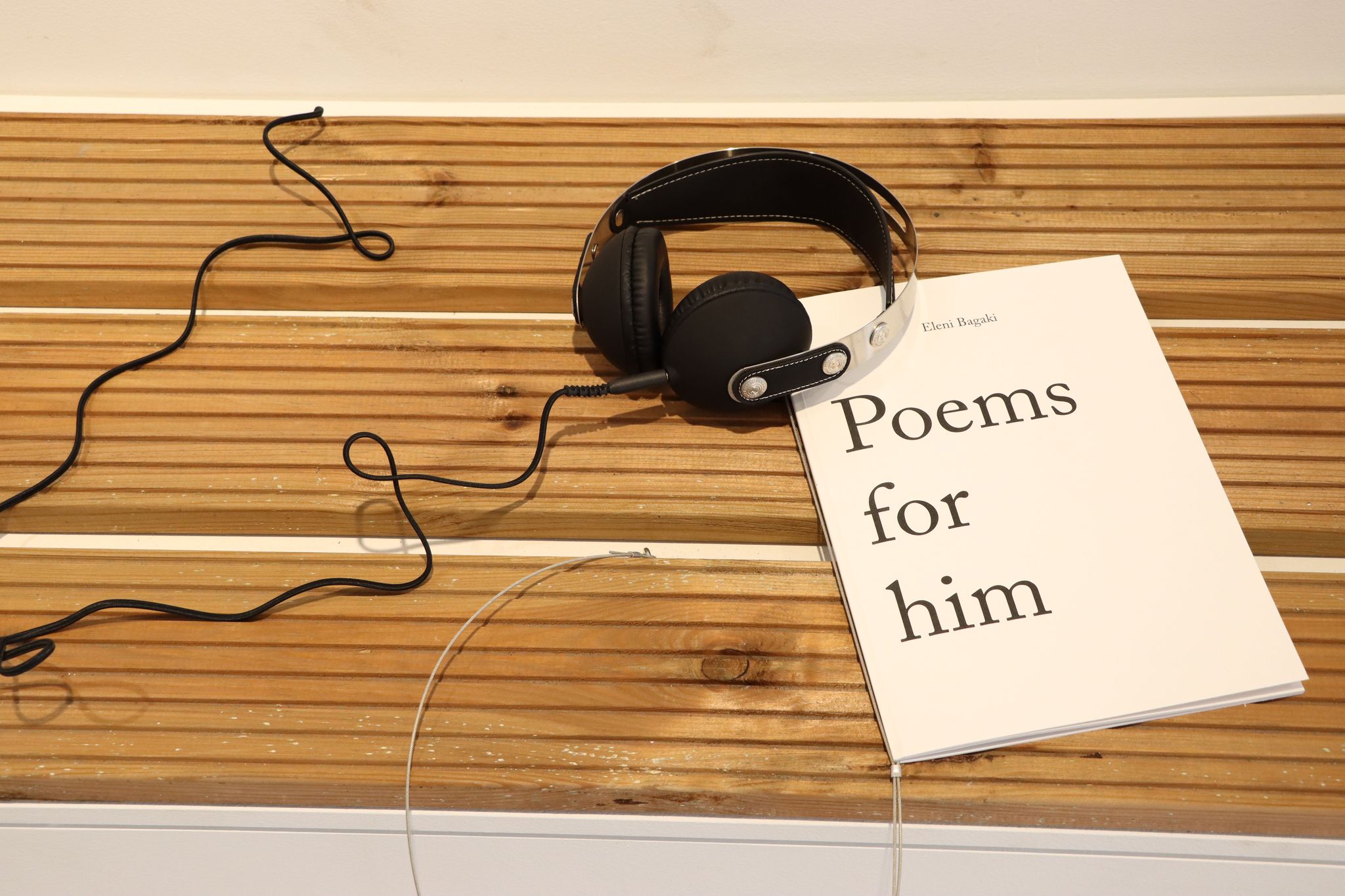 Τέσσερα ποιήματα που επέλεξα από το “Poems for him”, μελοποιημένα από την Anna vs June. Το βιβλίο αυτό, το πέμπτο μου, το σχεδιάσαμε ως μέρος της έκθεσης αλλά, τελικά, λόγω ζήτησης, θα βγει κανονικά και θα πωλείται. Περιλαμβάνει μικρά ποιήματα, κυρίως φράσεις “για εκείνον”, τις οποίες έγραφα το 2016 στο κινητό μου καθ’ οδόν προς το πάρκο. Σε κάθε ακουστικό ακούγεται ένα τραγούδι.