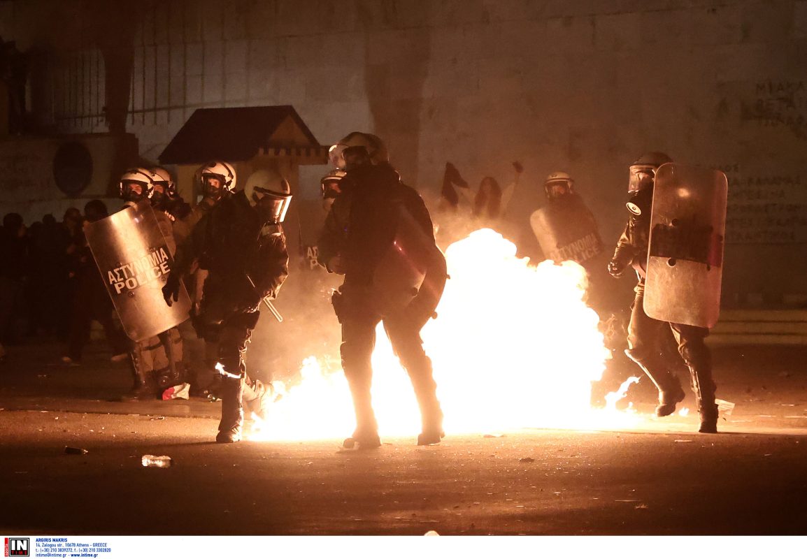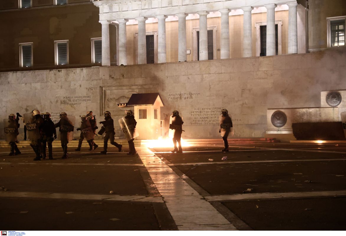 Τα επεισόδια ξέσπασαν περίπου στις 22:00, όταν ομάδα κουκουλοφόρων έριξε μολότοφ, πέτρες και άλλα αντικείμενα στις αστυνομικές δυνάμεις, δίπλα από το άγαλμα του Αγνώστου Στρατιώτη. Οι αστυνομικοί απάντησαν κάνοντας χρήση χημικών, ενώ χρησιμοποιήθηκε και το υδροβόλο όχημα «Αίαντας».