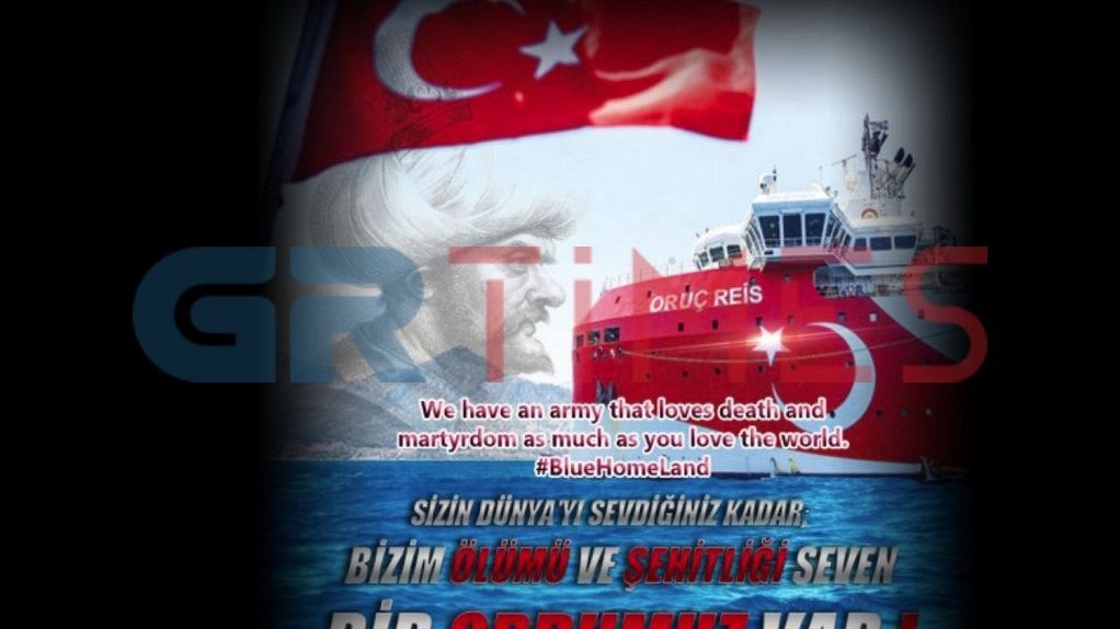 Σύμφωνα με το GRTimes.gr, οι Τούρκοι ανάρτησαν μία φωτογραφία με το τουρκικό πλοίο Oruc Reis γράφοντας το εξής μήνυμα: «Έχουμε έναν στρατό που αγαπάει τον θάνατο και το μαρτύριο τόσο όσο αγαπάτε εσείς τον κόσμο #BlueHomeLand»