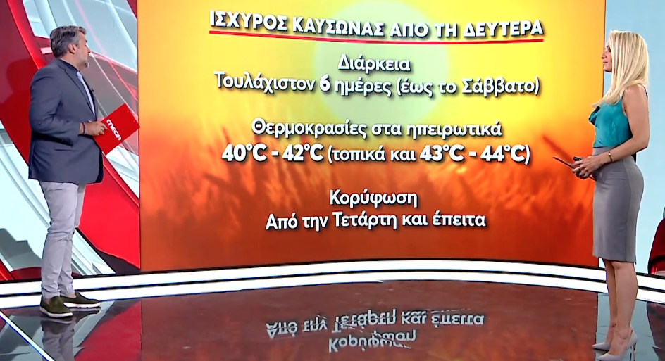 Οπως είπε ο Γιάννης Καλλιάνος ο ισχυρός καύσωνας θα έχει διάρκεια έξι ημέρες και “οι πιο δύσκολες θα είναι από την Τετάρτη και έπειτα. Εκεί φαίνεται ότι θα κορυφωθεί ο καύσωνας”, όπως ανέφερε χαρακτηριστικά.
