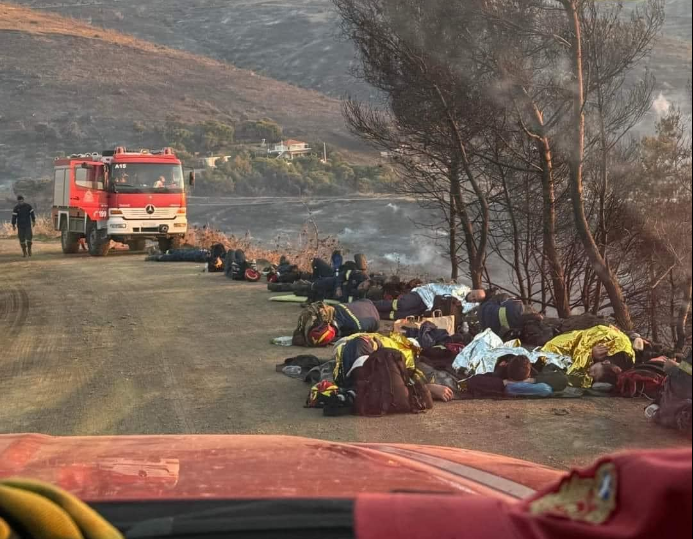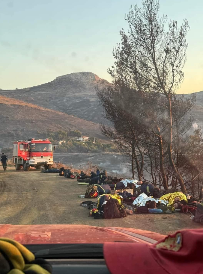 Μία συγκλονιστική φωτογραφία έχει κυκλοφορήσει στα μέσα κοινωνικής δικτύωσης που δείχνει τους πυροσβέστες, που επιχείρησαν στην φωτιά στην Κερατέα, να έχουν ξαπλώσει για να ξεκουραστούν δίπλα από το καμμένο τοπίο.