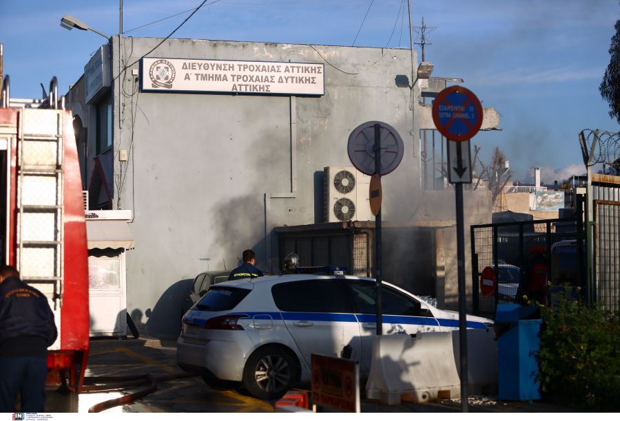 Ο δρόμος μπροστά από την Τροχαία Περιστερίου αποκλείστηκε για την κατάσβεση της φωτιάς.