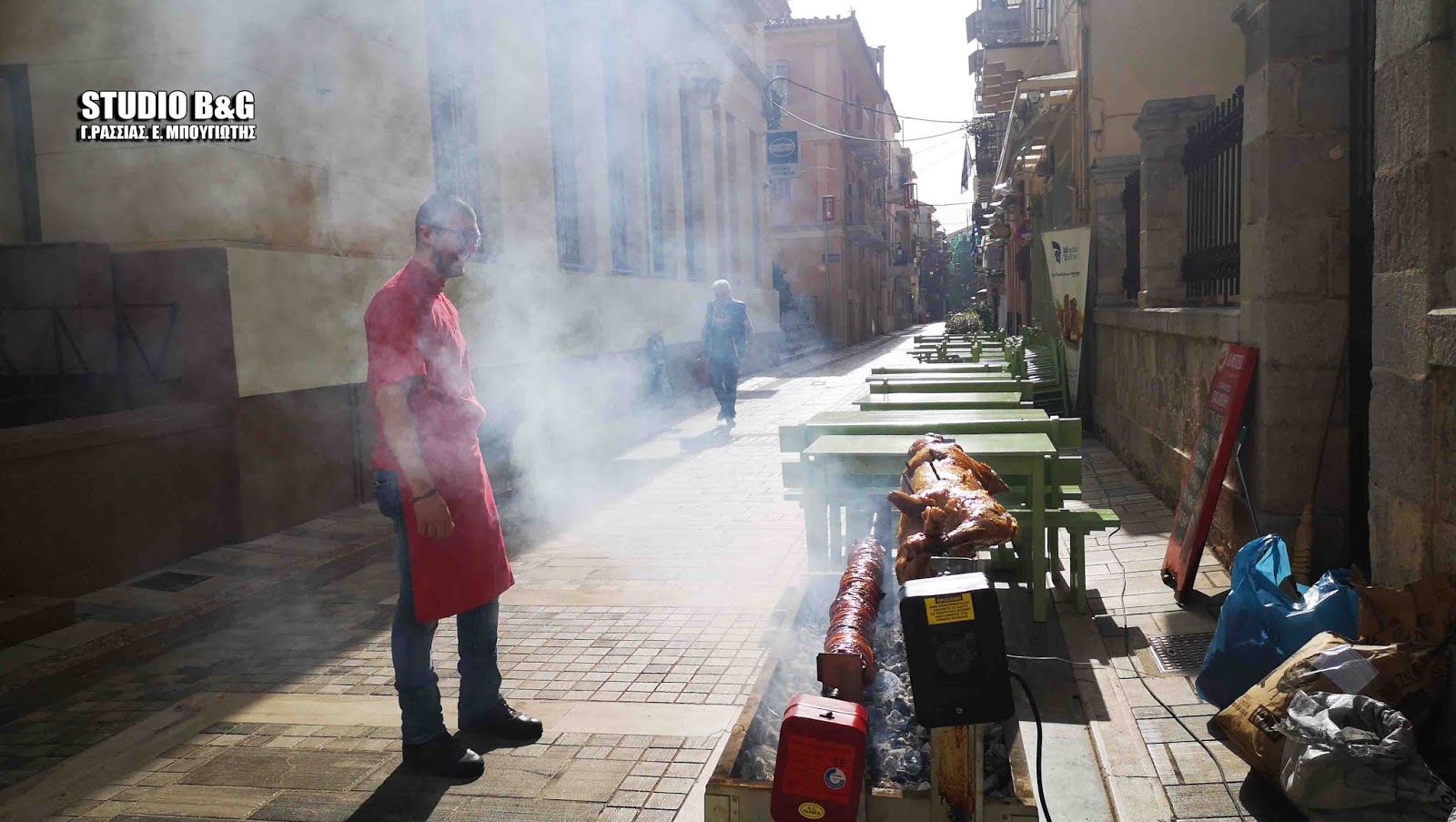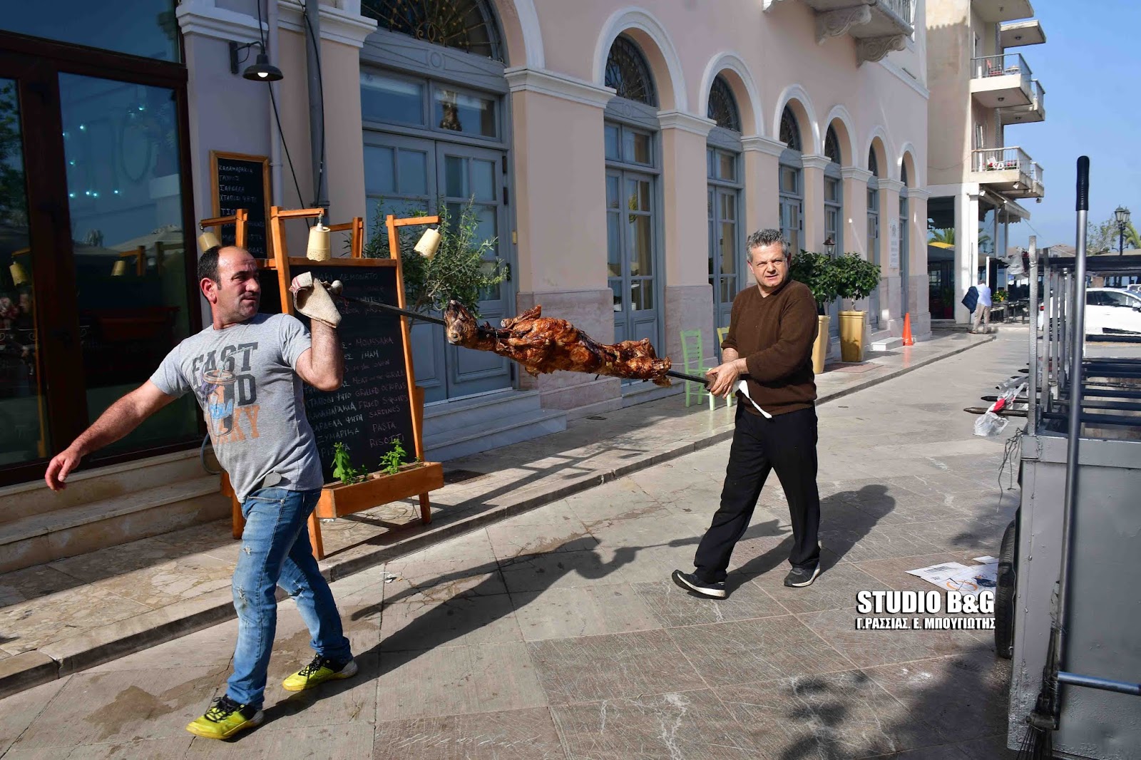 Το έθιμο αλλά και η προσέλκυση πελατών θέλει τα παραδοσιακά καταστήματα εστίασης του Ναυπλίου να ψήνουν τα αρνιά στον δρόμο και τα πεζοδρόμια κυρίως της παλιάς πόλης.