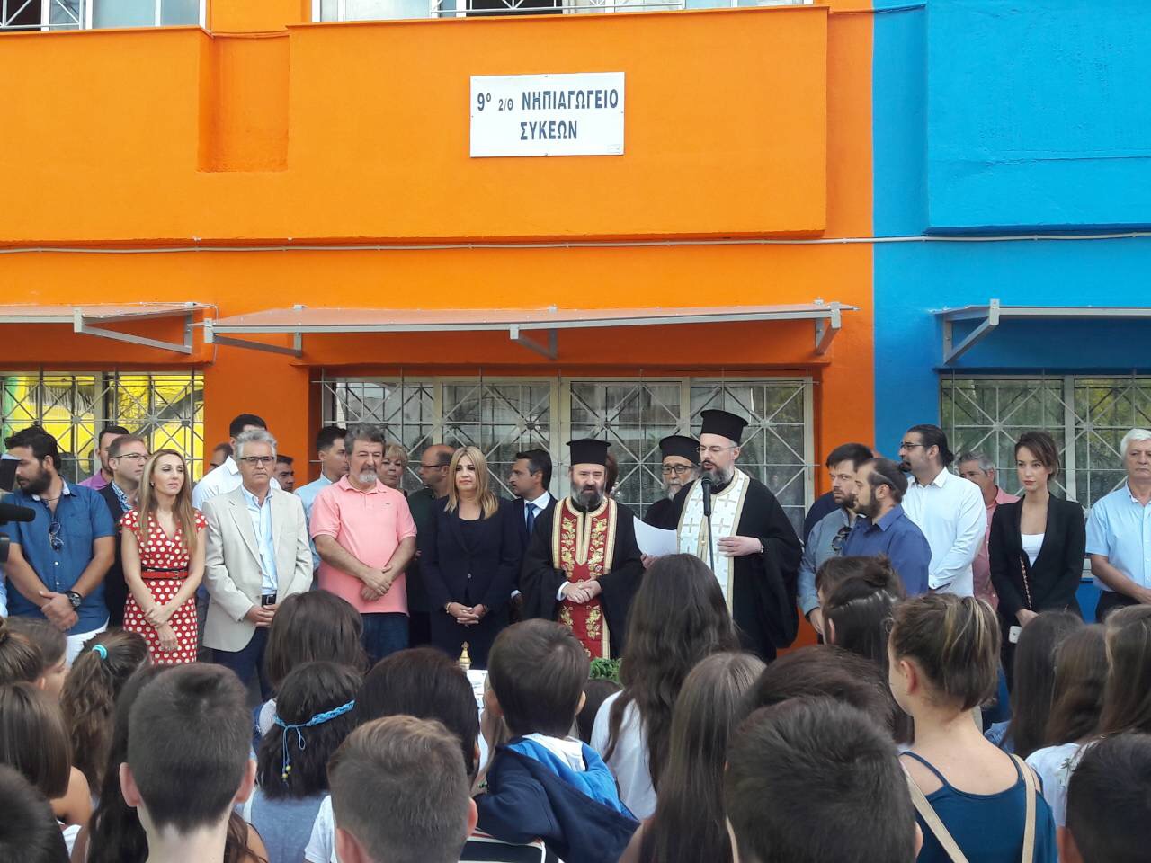 Στον αγιασμό για την έναρξη της σχολικής χρονιάς, που τελέστηκε στο 4ο και 11ο Δημοτικό σχολείο Συκεών, παρέστη η επικεφαλής του Κινήματος Αλλαγής Φώφη Γεννηματά.