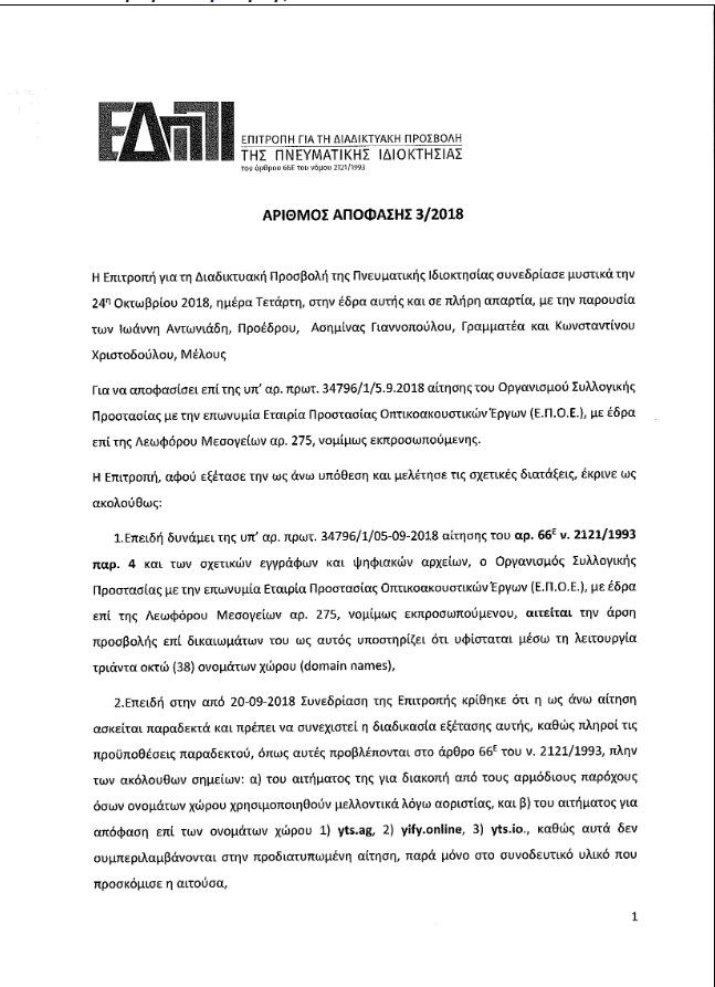 Η εξέλιξη έρχεται μετά την πρώτη απόφαση της Επιτροπής για τη Διαδικτυακή Προσβολή Δικαιωμάτων Πνευματικής Ιδιοκτησίας (ΕΔΠΠΙ).