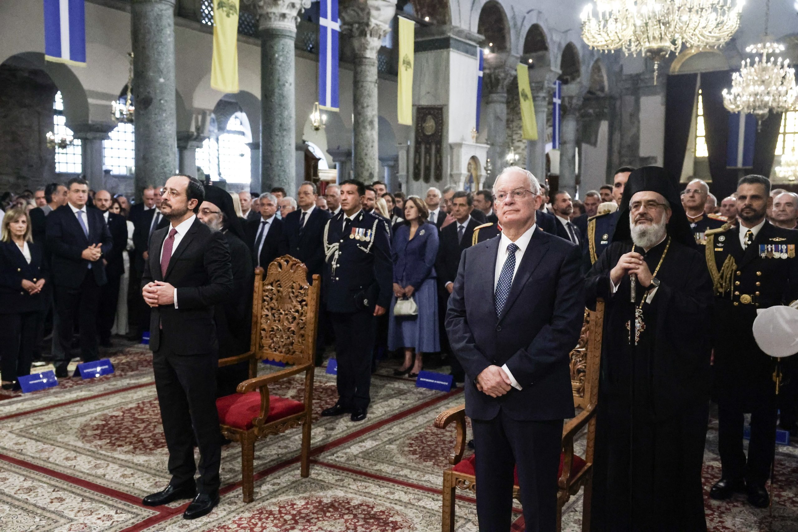 «Όσο συνεχίζεται η τουρκική εισβολή, Κύπρος και Ελλάδα, δεν έχουμε άλλη επιλογή από το να πράξουμε το παν για να επανενώσουμε την πατρίδα μας», επισήμανε ο Πρόεδρος της Κυπριακής Δημοκρατίας Νίκος Χριστοδουλίδης, μετά το τέλος της επίσημης δοξολογίας στον ναό του Αγίου Δημητρίου.