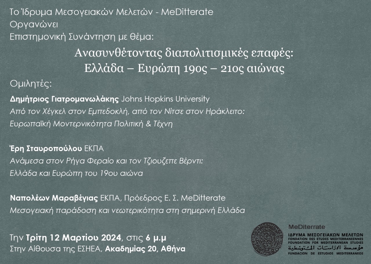 Το Ίδρυμα Μεσογειακών Μελετών-MeDitterate οργανώνει επιστημονική συνάντηση με θέμα «Ανασυνθέτοντας διαπολιτισμικές επαφές: Ελλάδα- Ευρώπη 19ος- 20ος αιώνας».